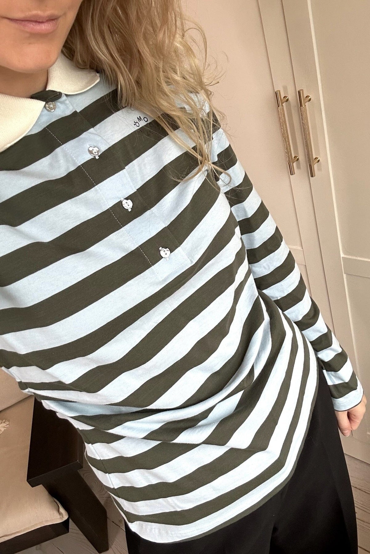 Lange mouwen polo van Modström in biologisch katoen. Ontworpen met horizontale strepen in lichtblauwe en donkergroene tinten en een witte polokraag met knoopsluiting.