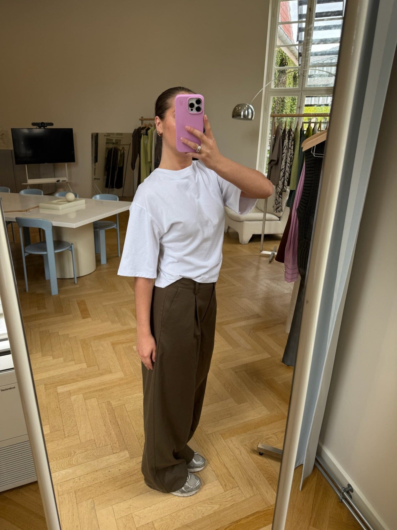 Witte t-shirt van Modström in biologische katoen. De t-shirt heeft een figuurgetailleerde pasvorm met brede, korte mouwen en een ronde halslijn.