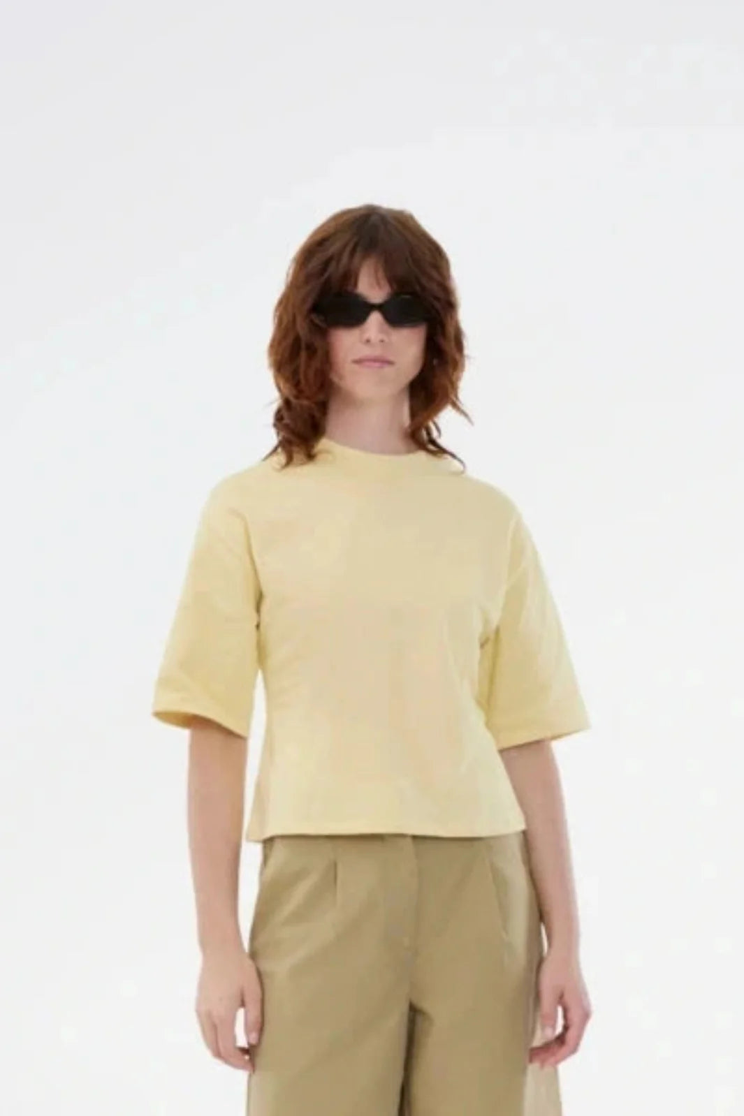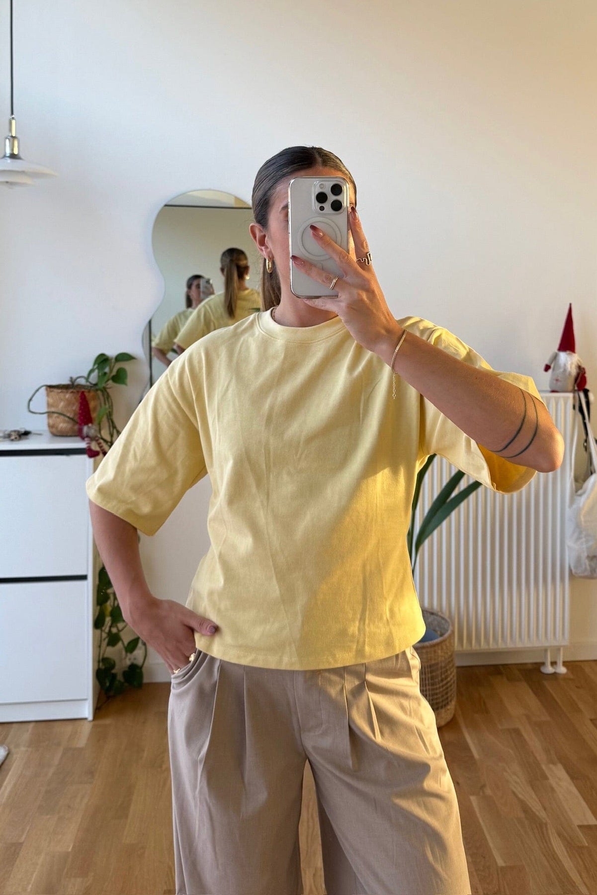 Een lichtgeel T-shirt van Modström, gemaakt van 100% biologisch katoen. Het T-shirt is licht cropped en heeft een aangesloten pasvorm.
