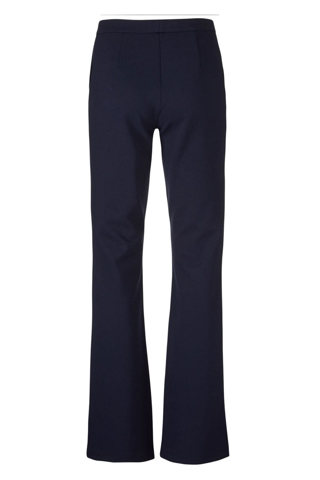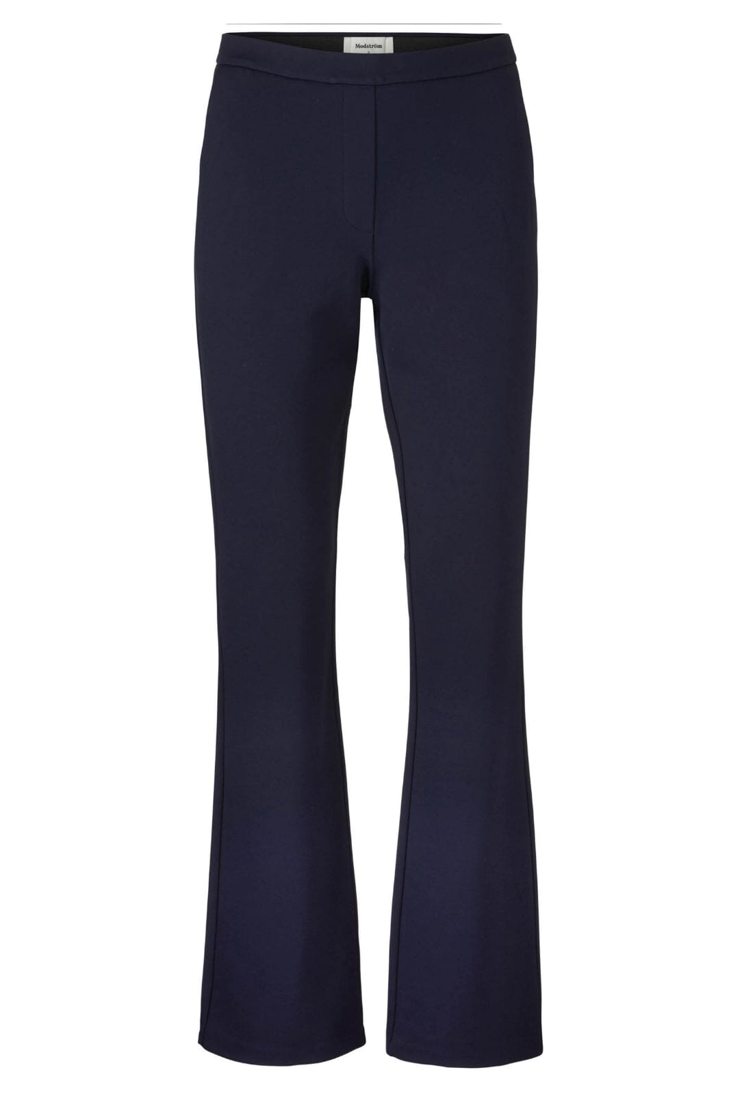 Marineblau broek van Modström met flare-pijpen en elastische taille. De broek heeft schuine zakken en is gemaakt van een rekbaar materiaal dat goede bewegingsvrijheid biedt.