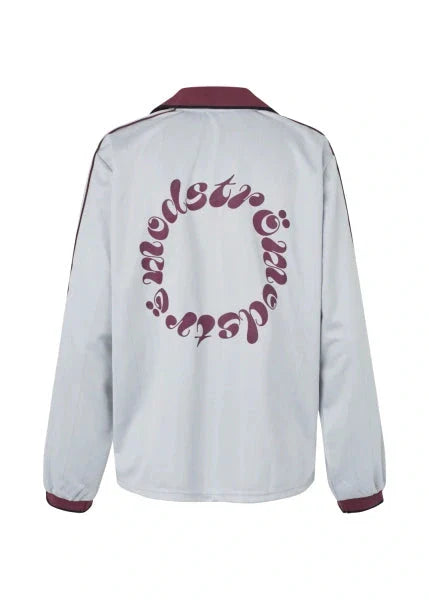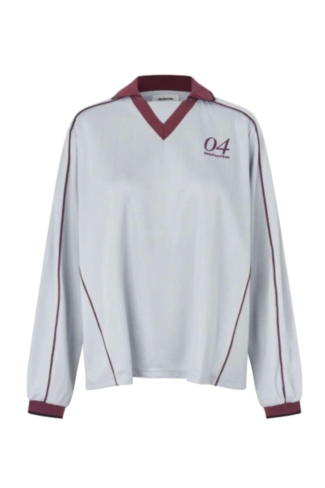 Lichtgrijs T-shirt met lange mouwen van Modström van 100% polyester. Het T-shirt heeft een polokraag met V-hals en donkerrode details op de kraag, de manchetten en langs de mouwen.