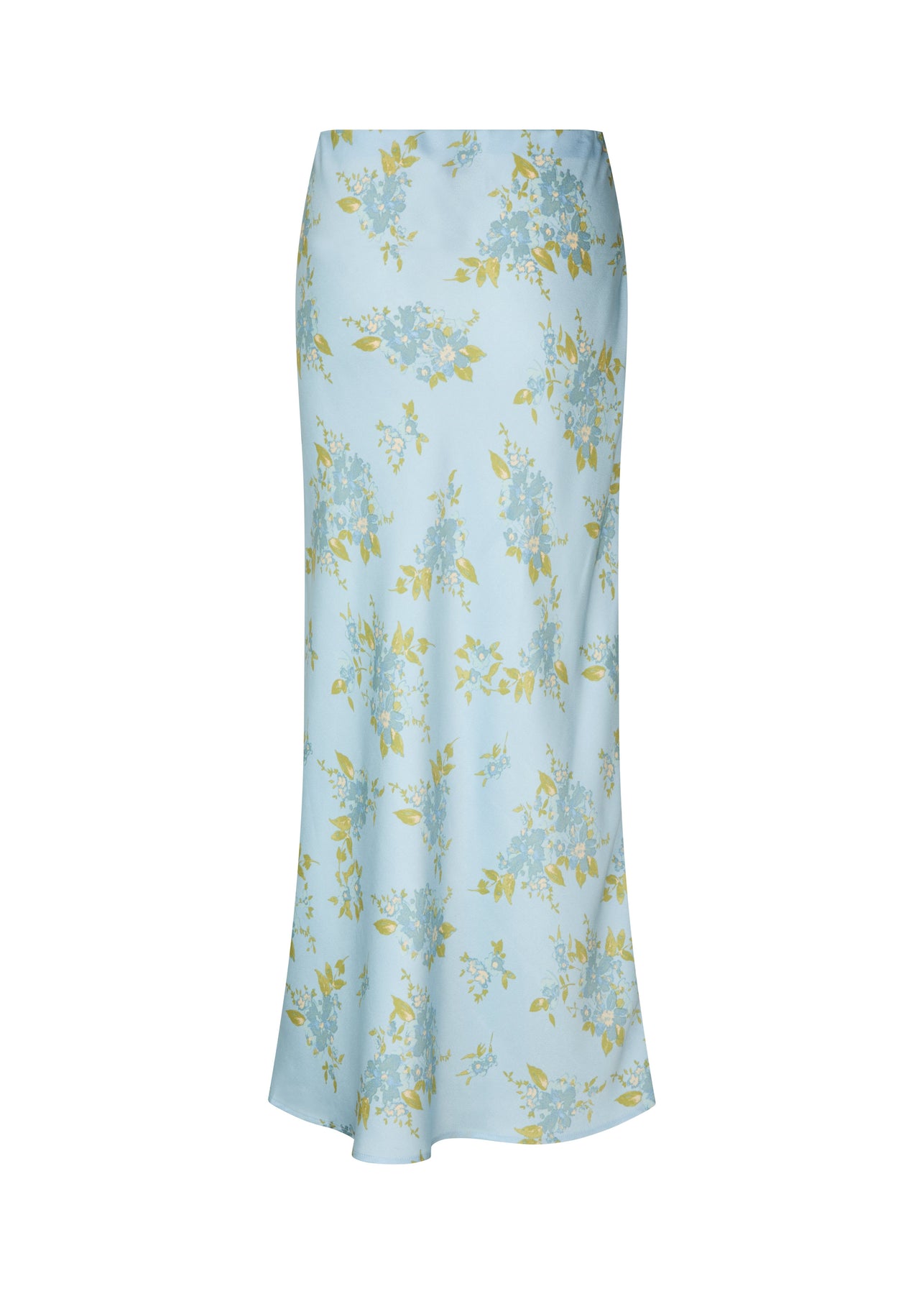 Lange rok van Modström met een romantische bloemenprint in gele en blauwe tinten op een lichtblauwe ondergrond. De rok is geschikt voor zowel feestelijke gelegenheden als alledaags gebruik.