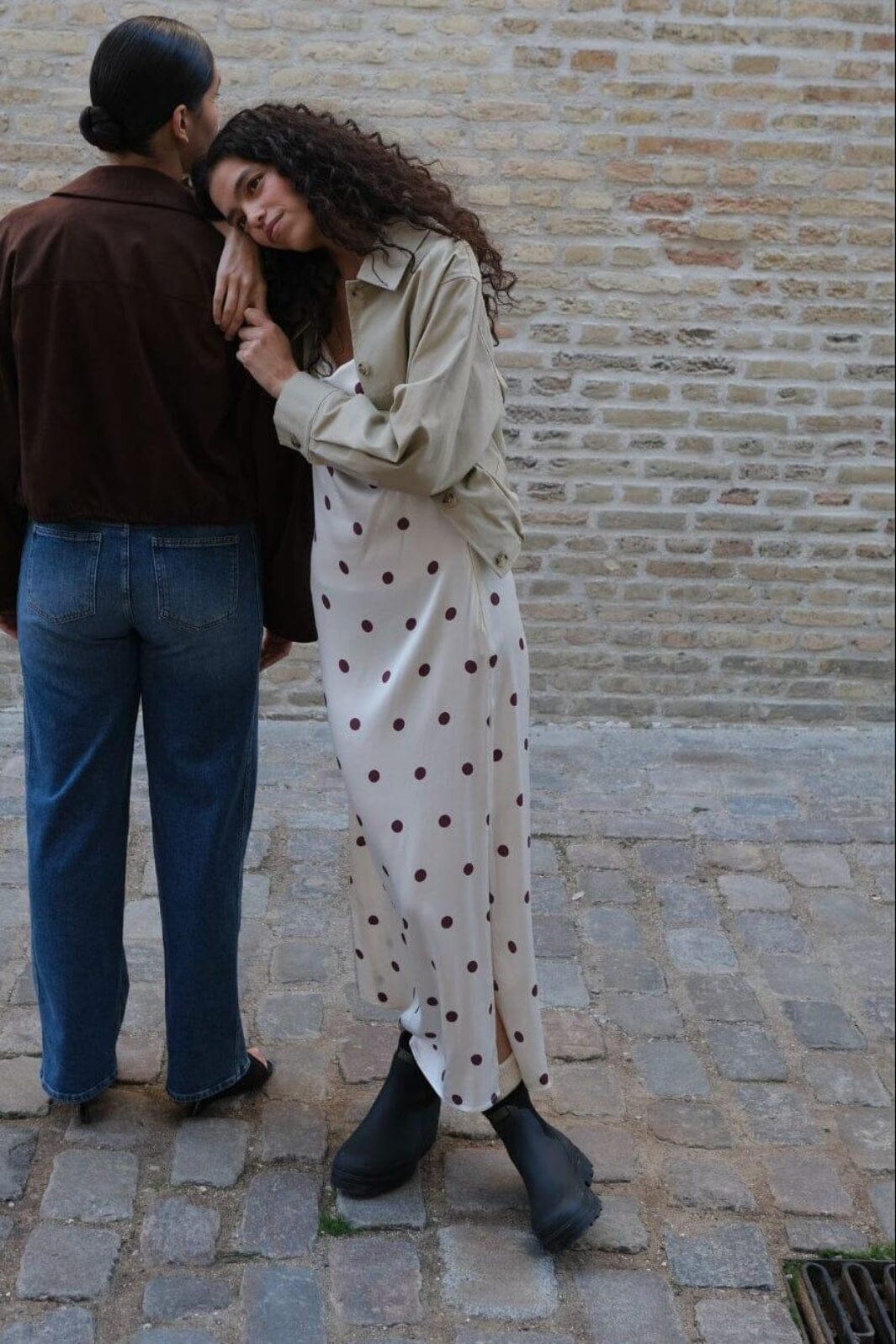 Lange jurk van Modström, gemaakt van 58% Lenzing™ Ecovero™ viscose en 42% viscose met wijnrode stippen op een lichte achtergrond.