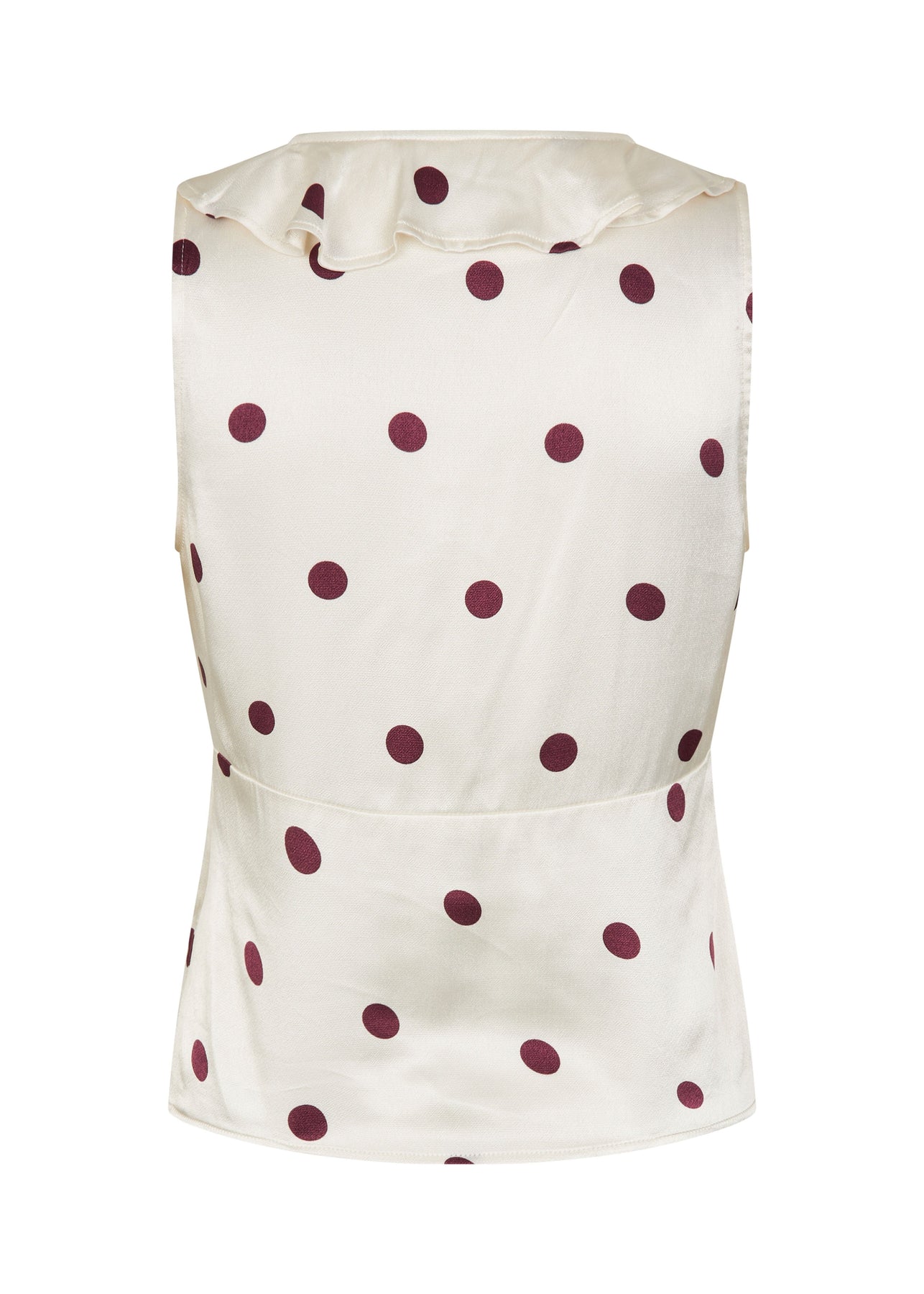 Mouwloze top van Modström met een polkadotpatroon in aalbeskleur op een crèmekleurige basis. De top heeft een V-hals met ruchesdetails en een striklint aan de voorkant.