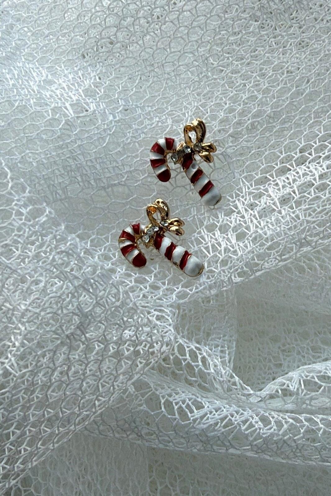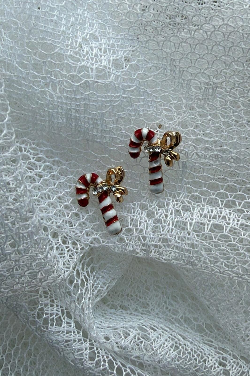 Oorbellen van Molly&My Jewellery, ontworpen als zuurstokken met rode en witte strepen. Ze hebben een klein goudkleurig strikje en een heldere steen.
