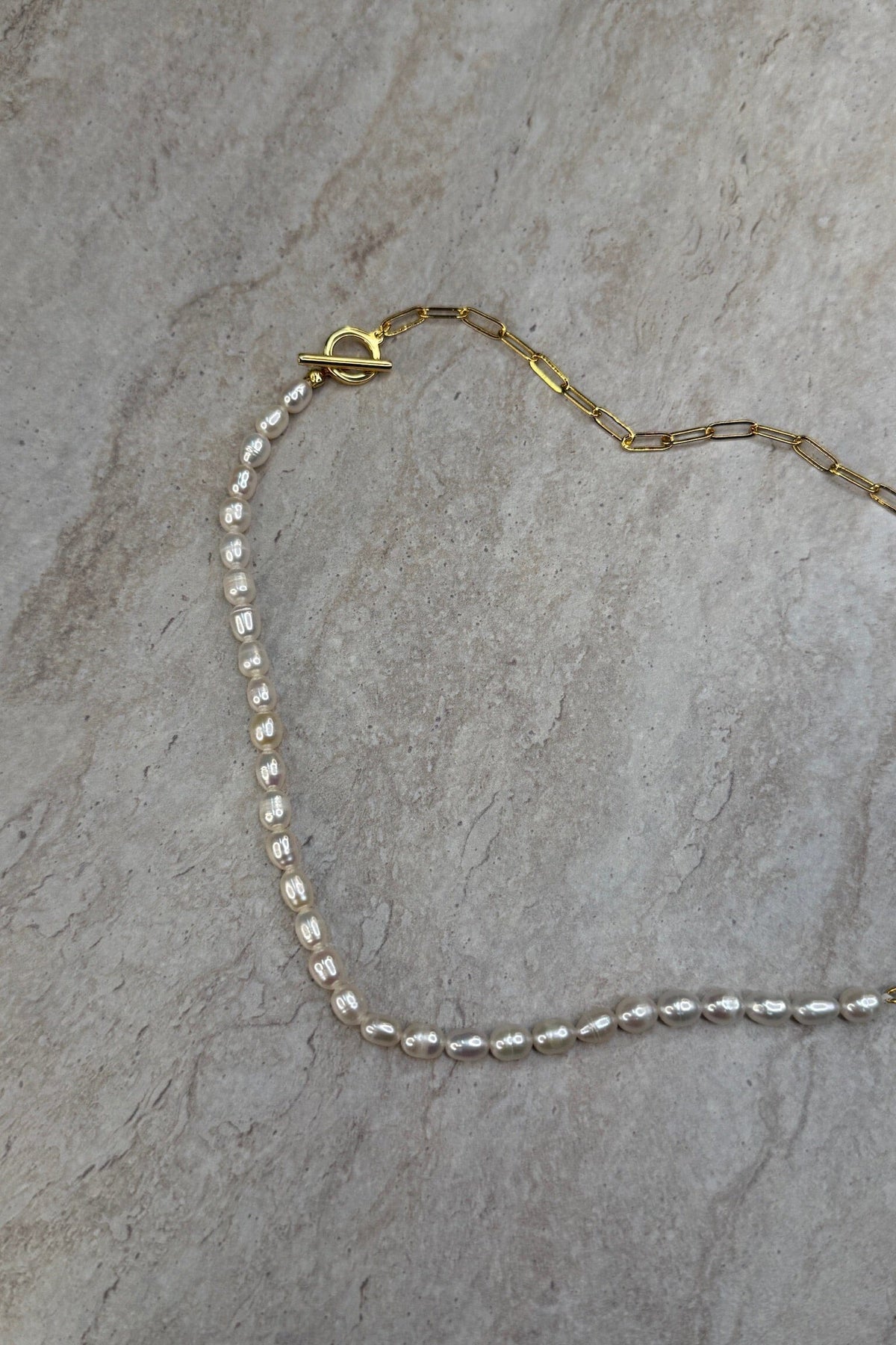 Ketting van Molly&My Jewellery met parels aan de ene helft en een goudkleurige ketting met langwerpige schakels aan de andere helft.
