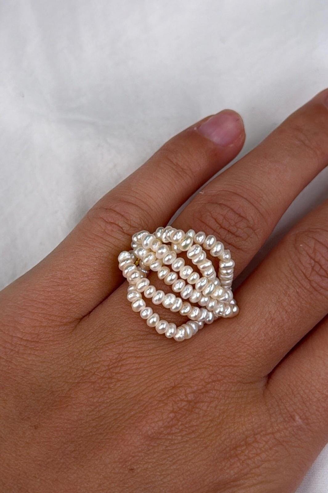 Vergulde ring van Molly&My Jewellery met een spiraalvormig design van kleine, parelachtige elementen die een groot deel van de vinger bedekken.