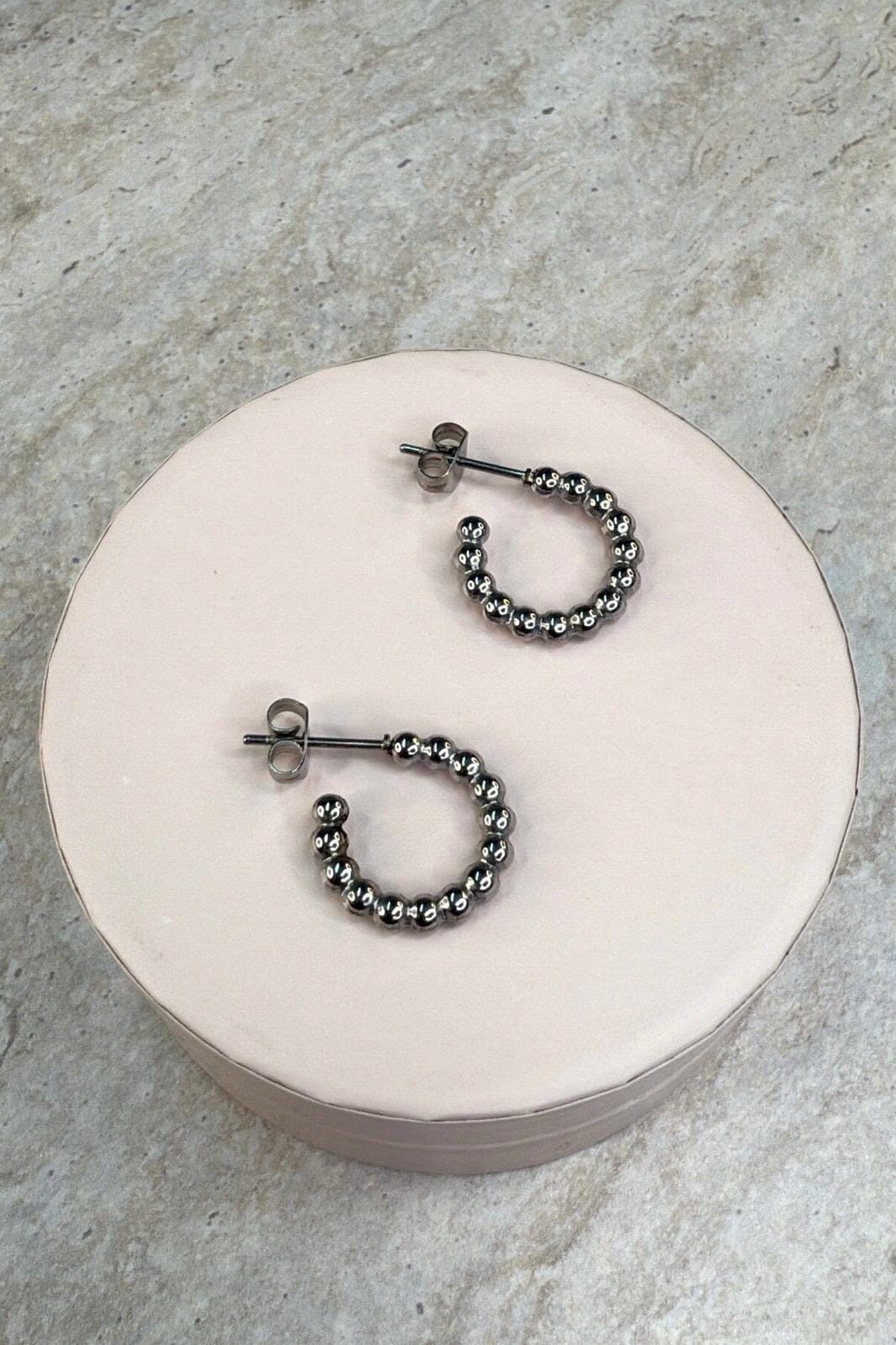 Hoop-oorbellen van Molly&My Jewellery met een parelpatroon. Kleine bolletjes vormen een cirkelvormige zilverkleurige ring.