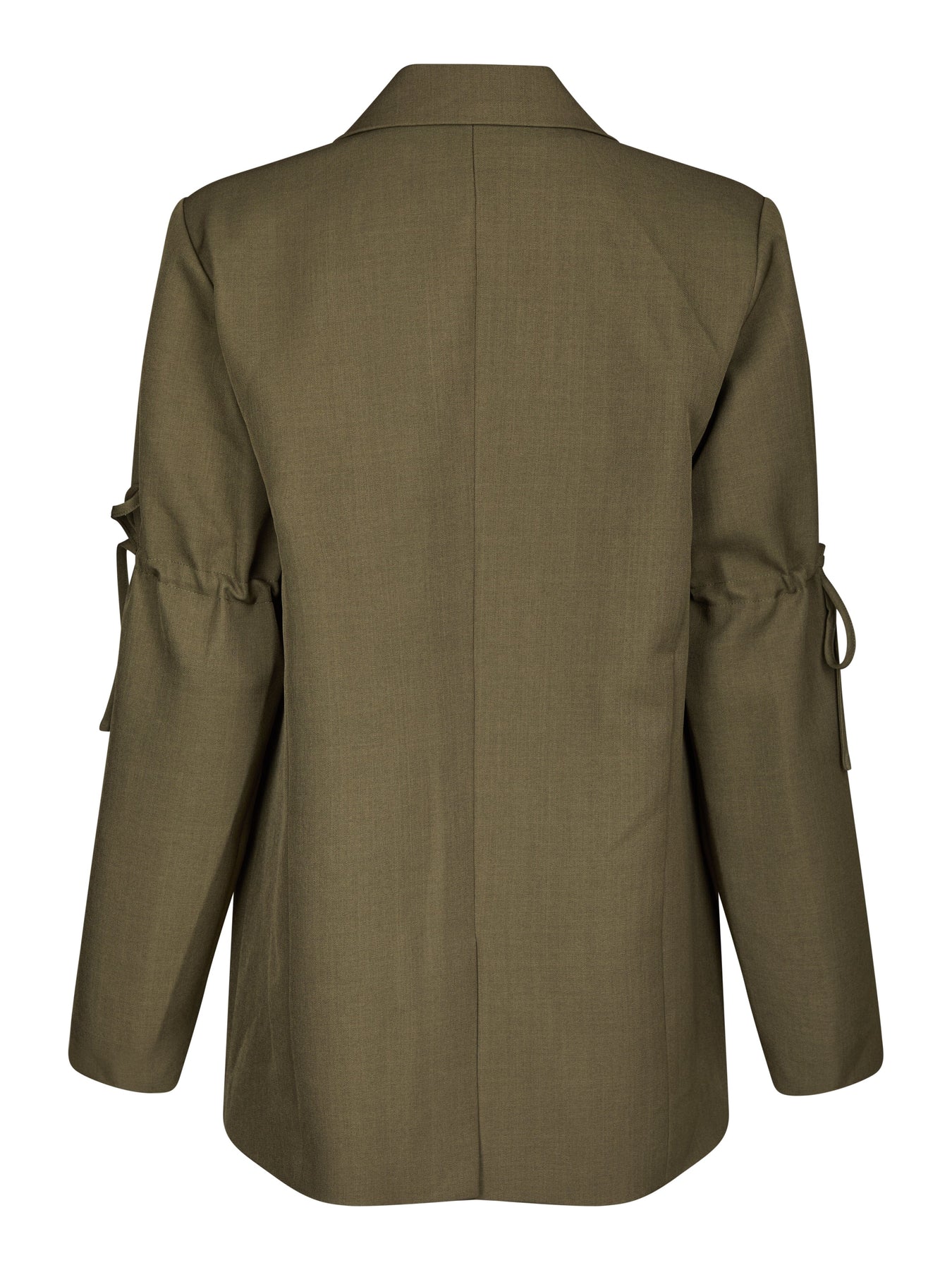 Blazer van Molly&My x Julie Elgaard in kaki groen. De blazer heeft strikdetails op de mouwen, decoratieve knopen aan de voorkant en twee voorzakken met kleppen.