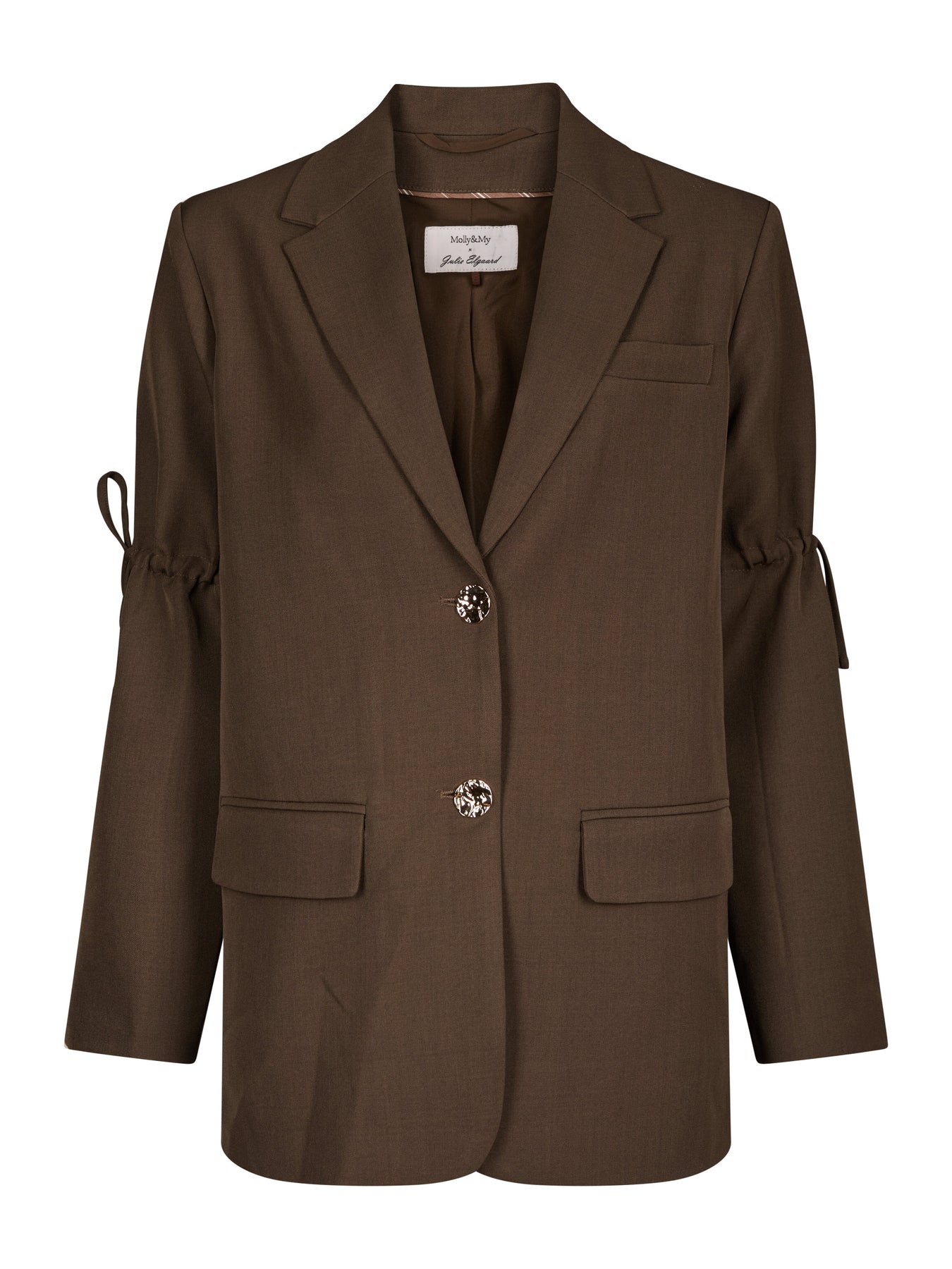 Donkerbruine blazer van Molly&My x Julie Elgaard met veterdetails op de mouwen. De blazer heeft een oversized pasvorm en een V-hals.