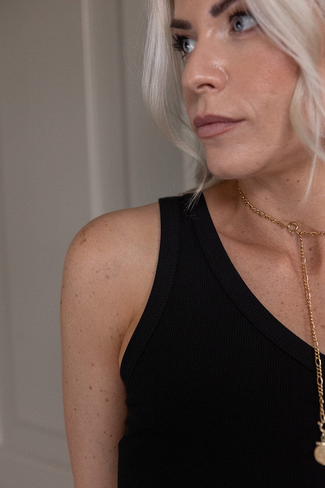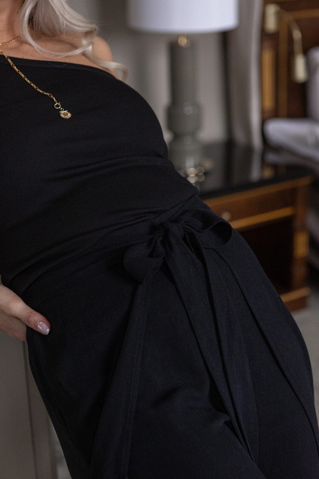 Zwart geribd topje van Molly & My X Melanie Due met off-shoulder design en asymmetrische schouderband. Het is geschikt voor zowel alledaagse als feestelijke gelegenheden.