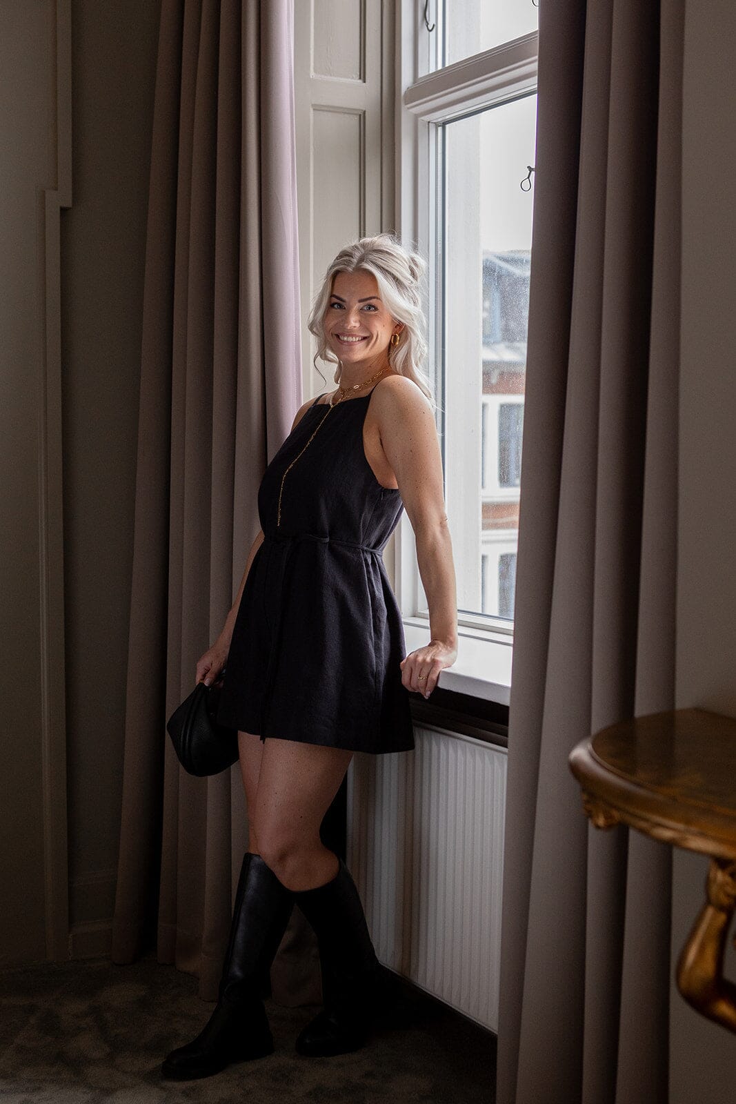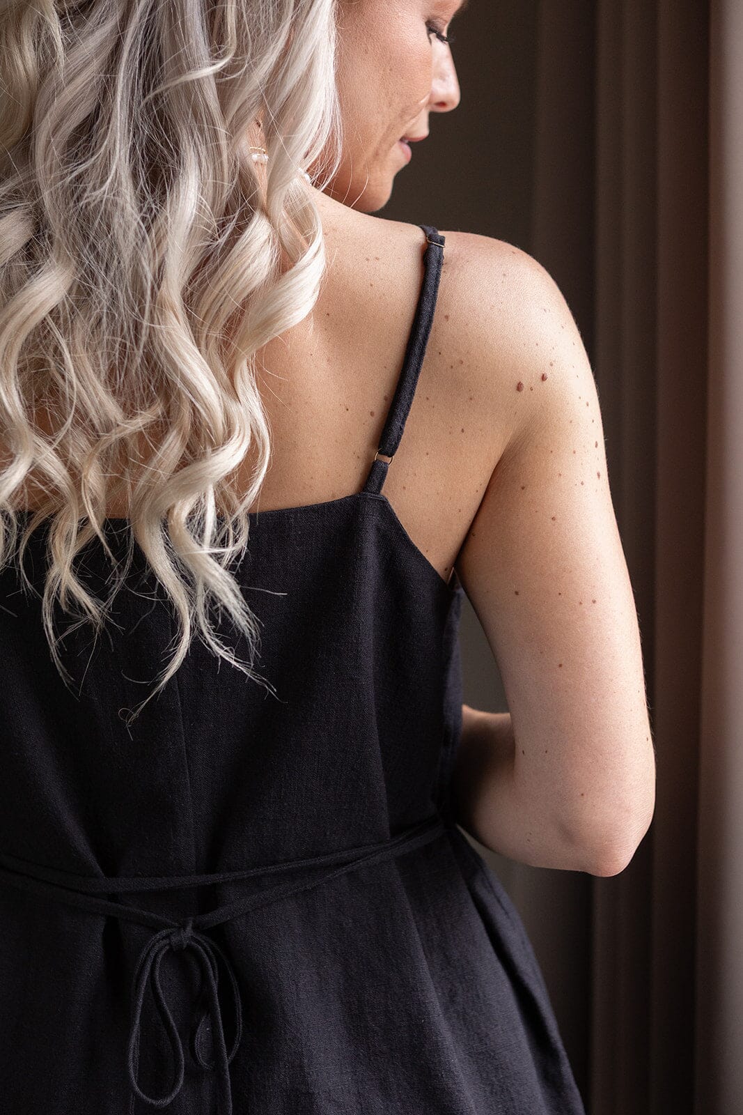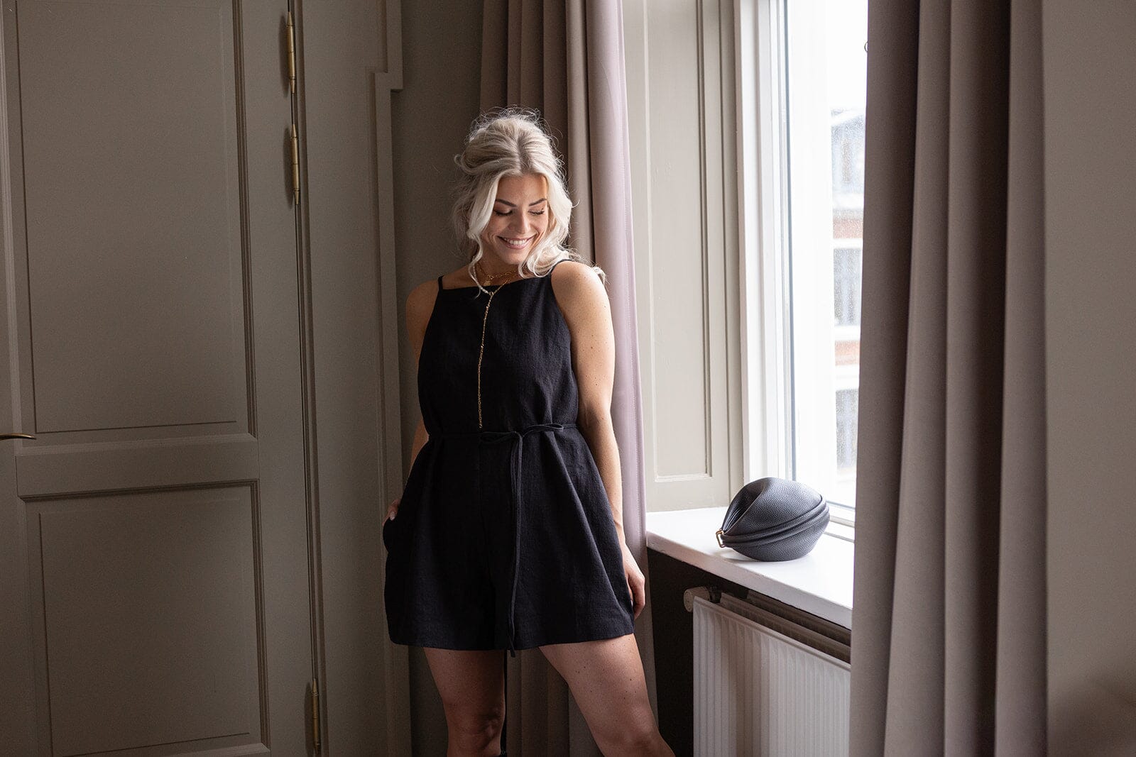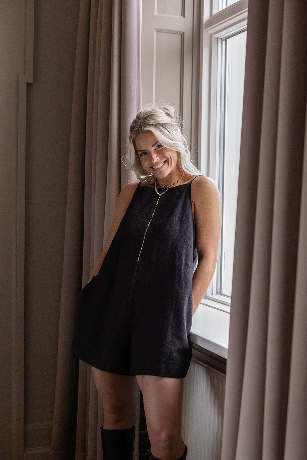 Zwarte jumpsuit van Molly & My X Melanie Due. De jumpsuit heeft dunne bandjes en een korte lengte die boven de knieën eindigt. Hij is gemaakt van zwarte stof met strikdetails in de taille.