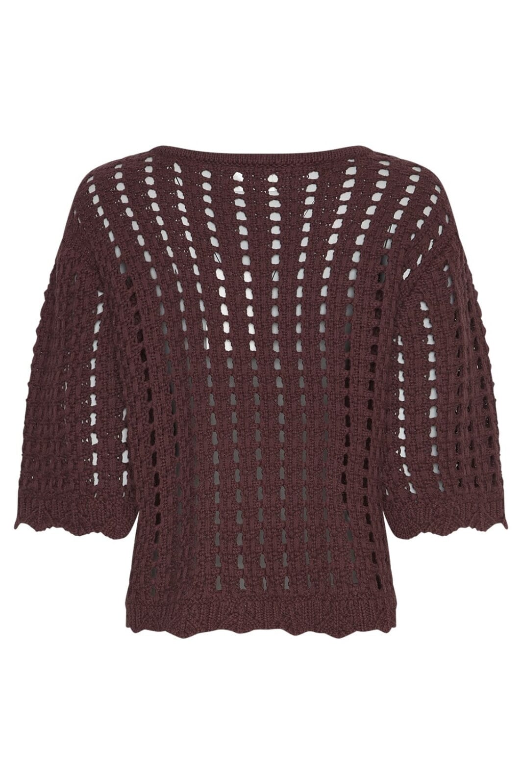 Gebreide trui in bruin met open breimuster en decoratieve stiksels. Het heeft een ronde halslijn en 3/4-mouwen met golvende rand.