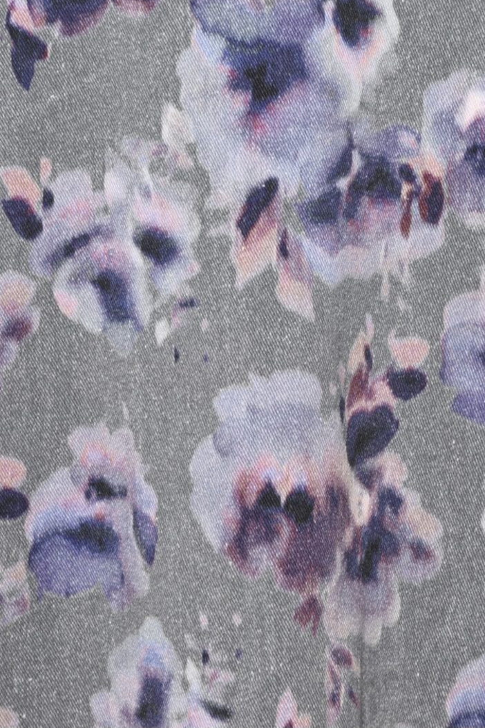 Jurk van Moves by Minimum in grijs met bloemenpatroon in paarse tinten. Hij heeft een polokraag en korte mouwen met een rits bij de hals.