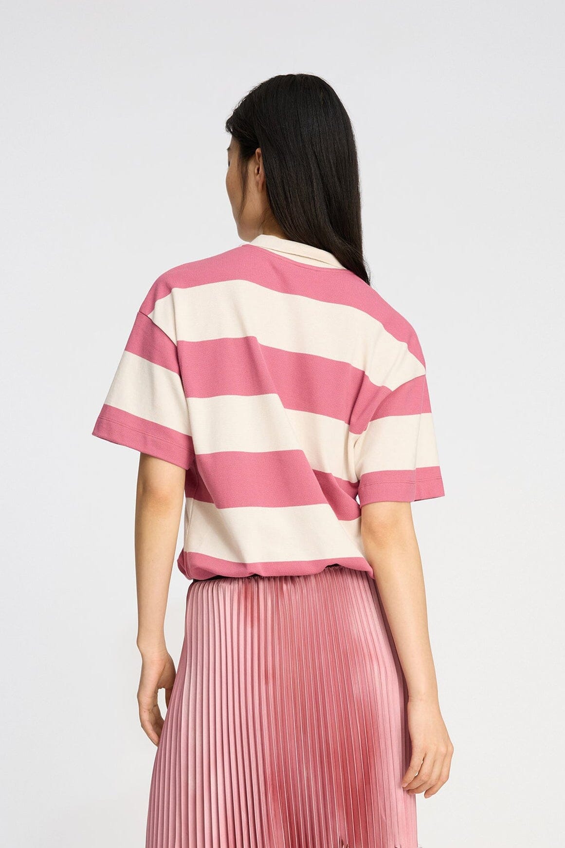 Gestreept poloshirt van MUNTHE met brede roze en offwhite strepen. Het poloshirt heeft een klassieke polokraag met knopen en een geborduurd MUNTHE-embleem op de borst.