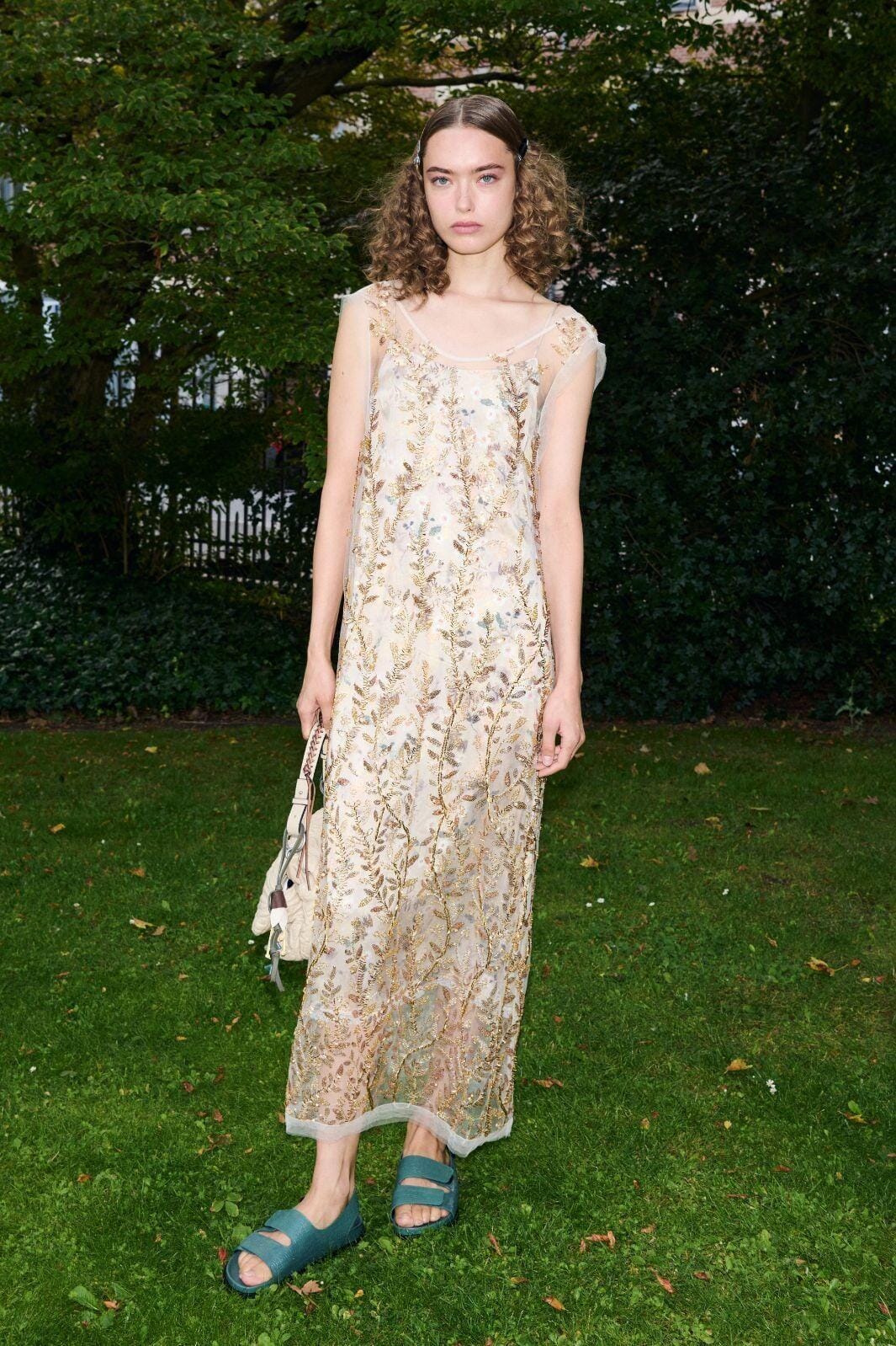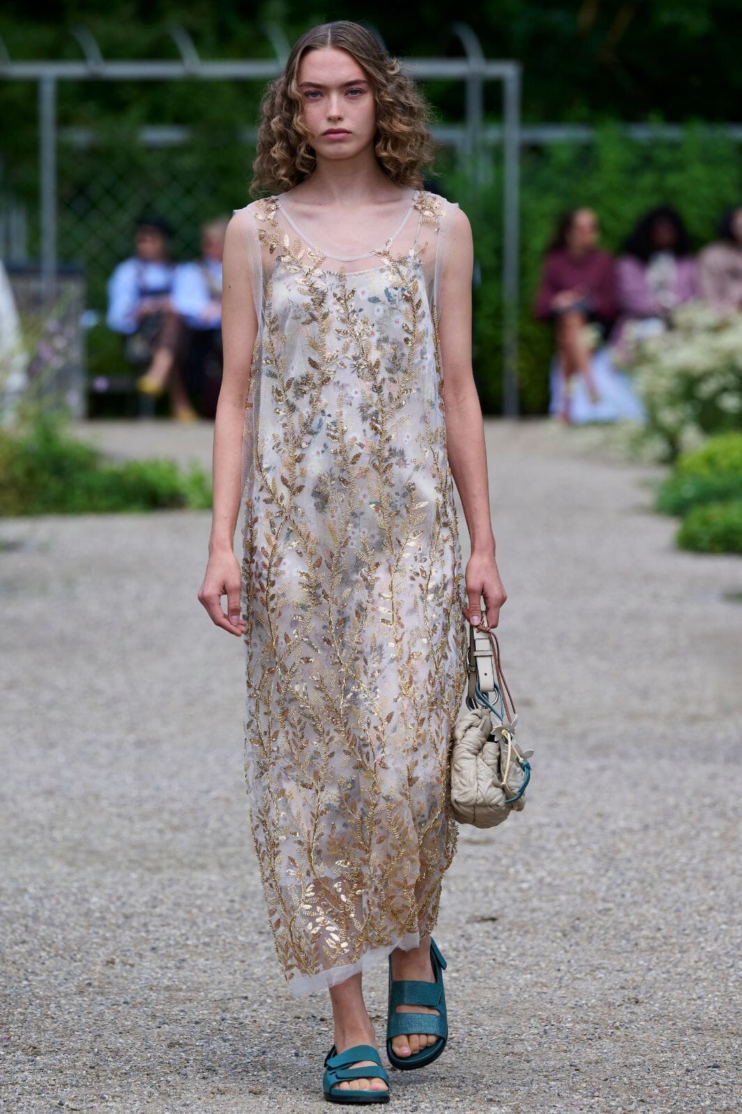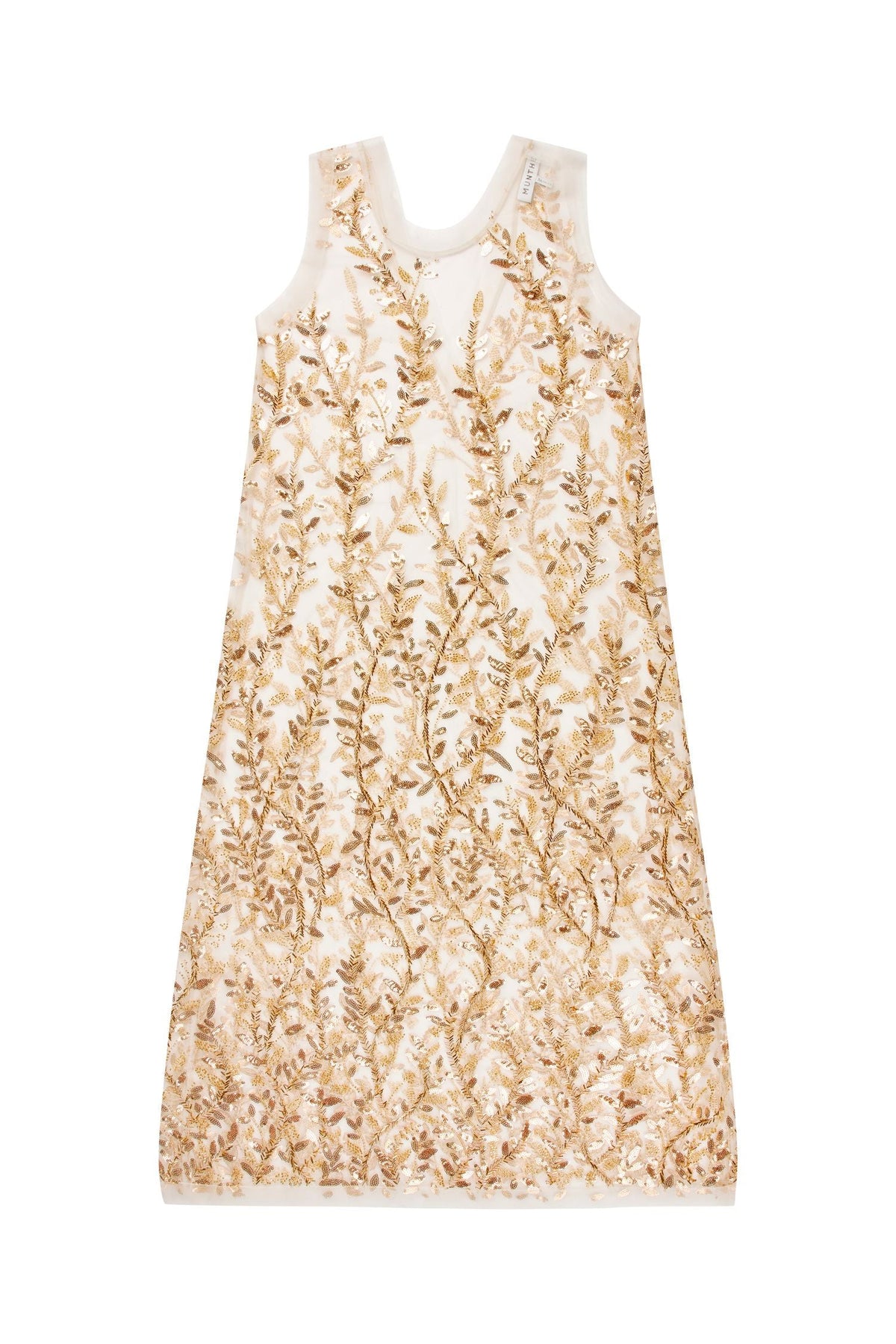 Jurk van Munthe in goud met een bloemmotief, gecreëerd door borduursel, pailletten en pareldetails, gerangschikt in een bladvormig patroon op semitransparante stof.