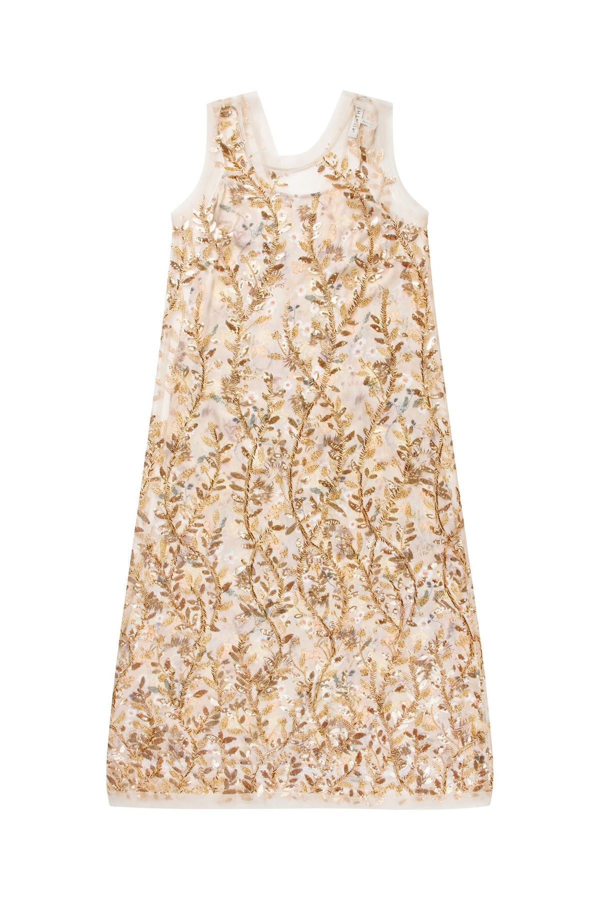 Jurk van Munthe in goud met een bloemmotief, gecreëerd door borduursel, pailletten en pareldetails, gerangschikt in een bladvormig patroon op semitransparante stof.