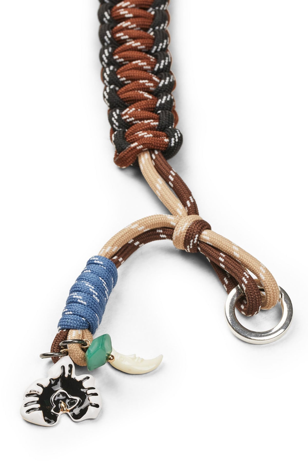 Zwarte schouderriem van Munthe met een gevlochten koord in bruine, zwarte en beige tinten. De riem heeft decoratieve hangers aan de uiteinden.