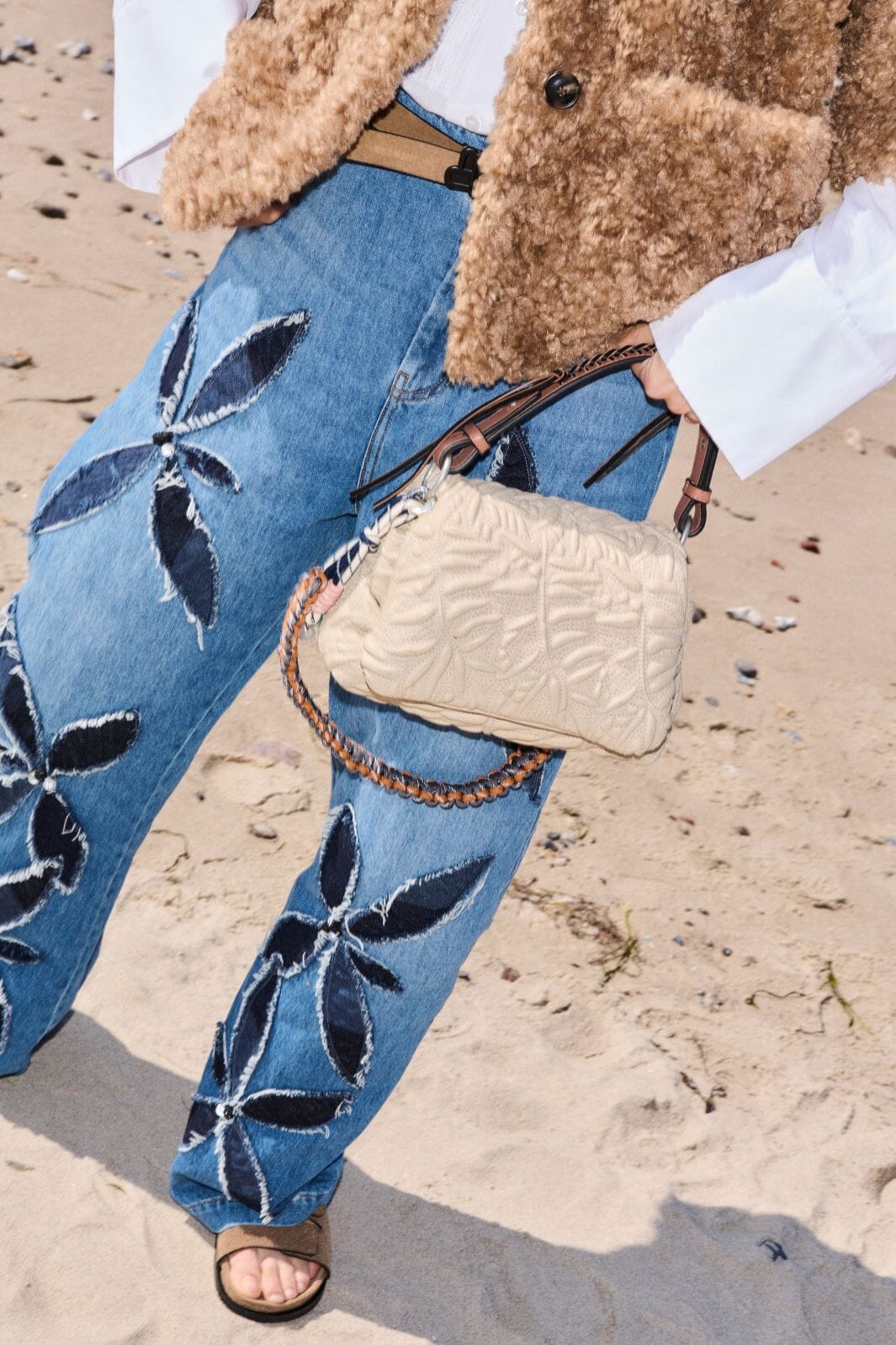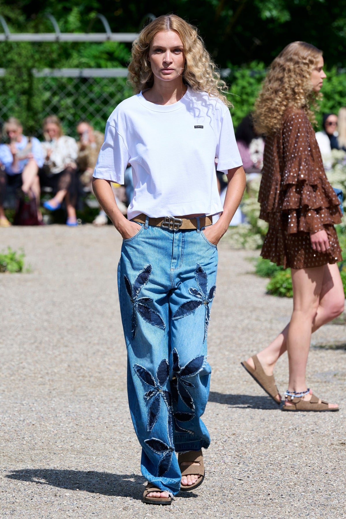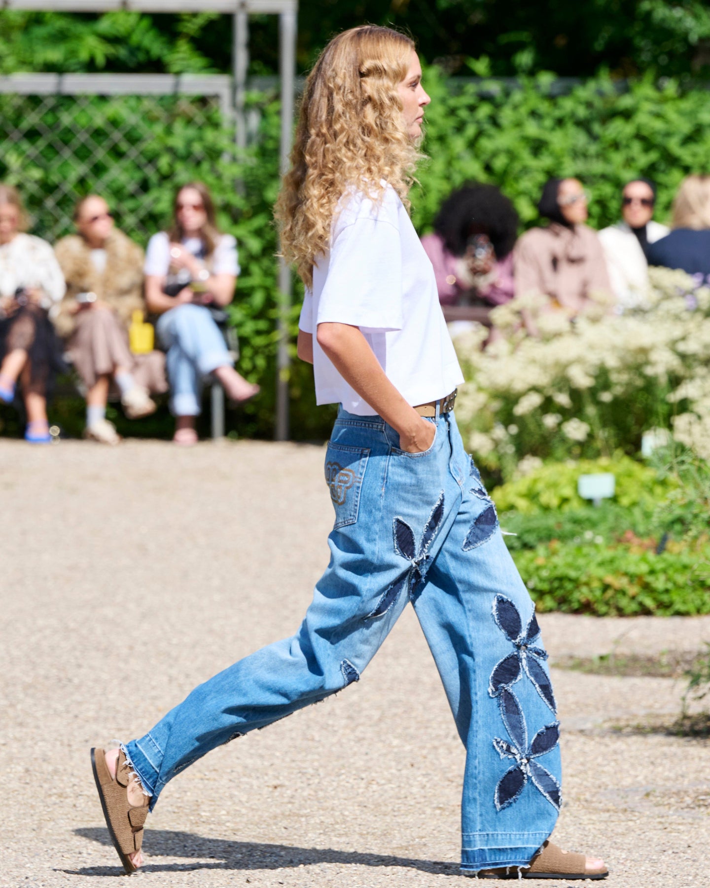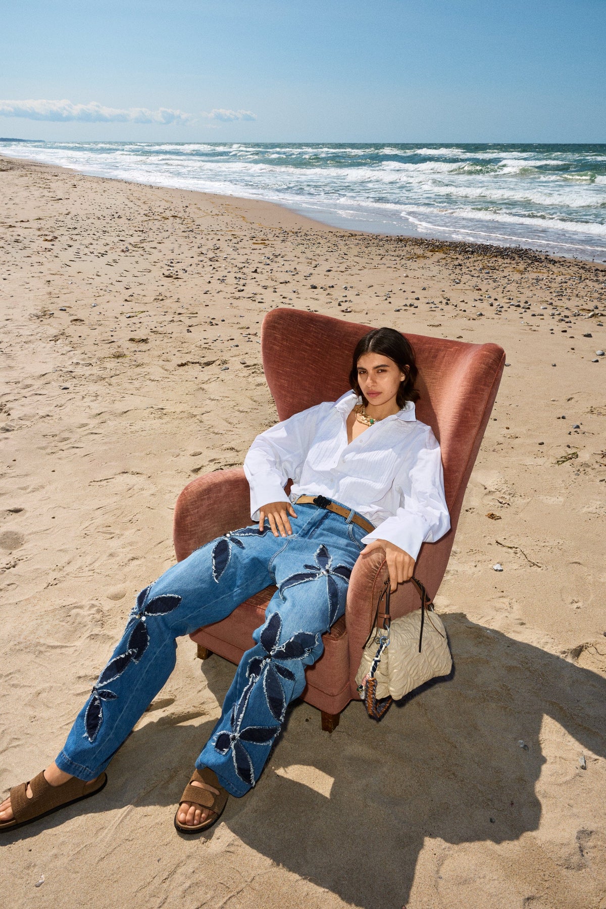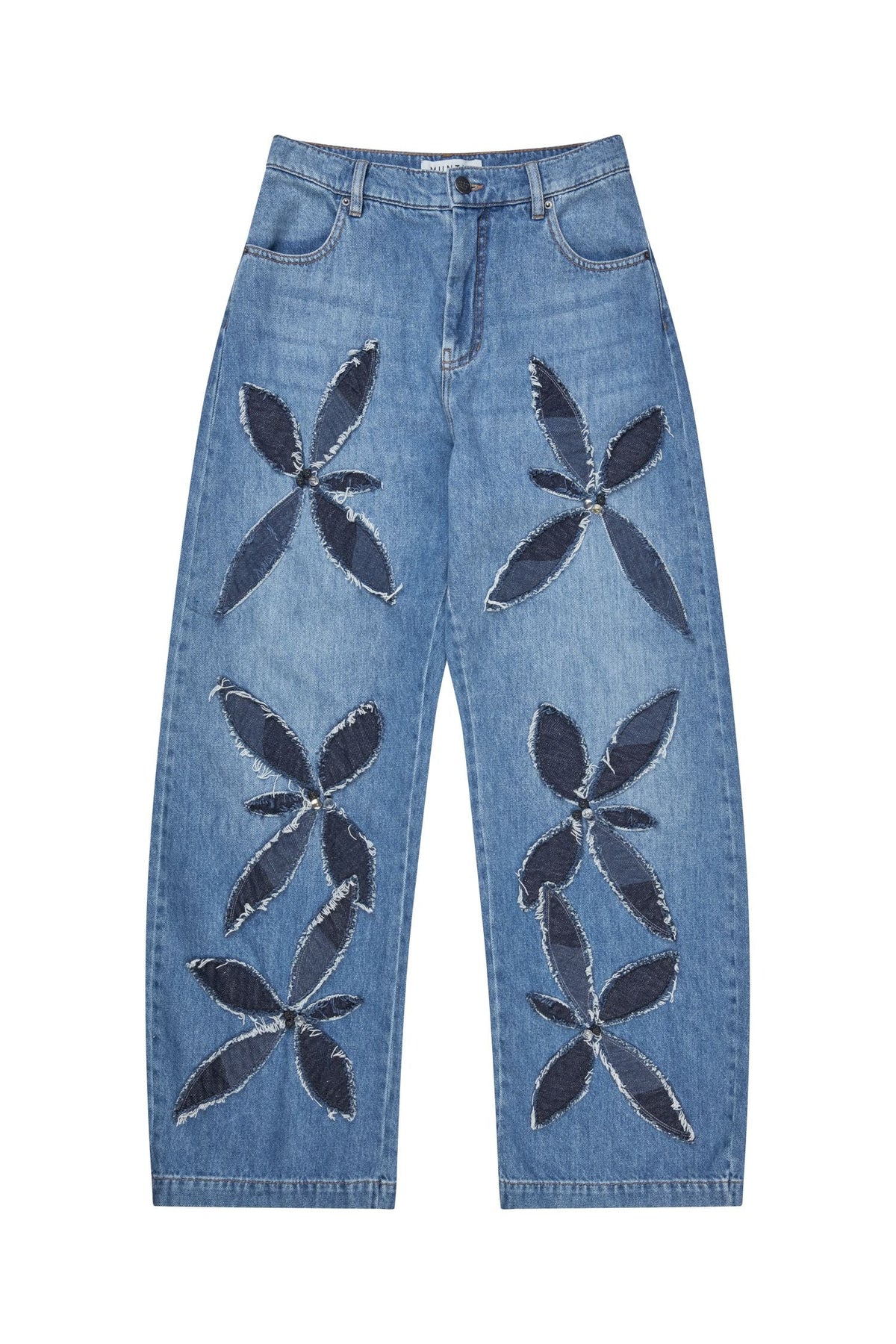 Jeans van Munthe in blauwe denim met grote, geappliqueerde bloemmotieven op de pijpen. Gemaakt van 100% biologisch katoen met contrastdenim en decoratieve stiksels.