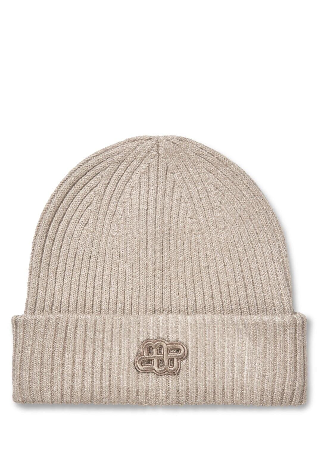 Beige muts van Munthe met ribgebreid ontwerp. De muts heeft een omgeslagen rand en een geborduurd logo aan de voorkant. Het is gemaakt van een zachte mix van gerecycled polyester.