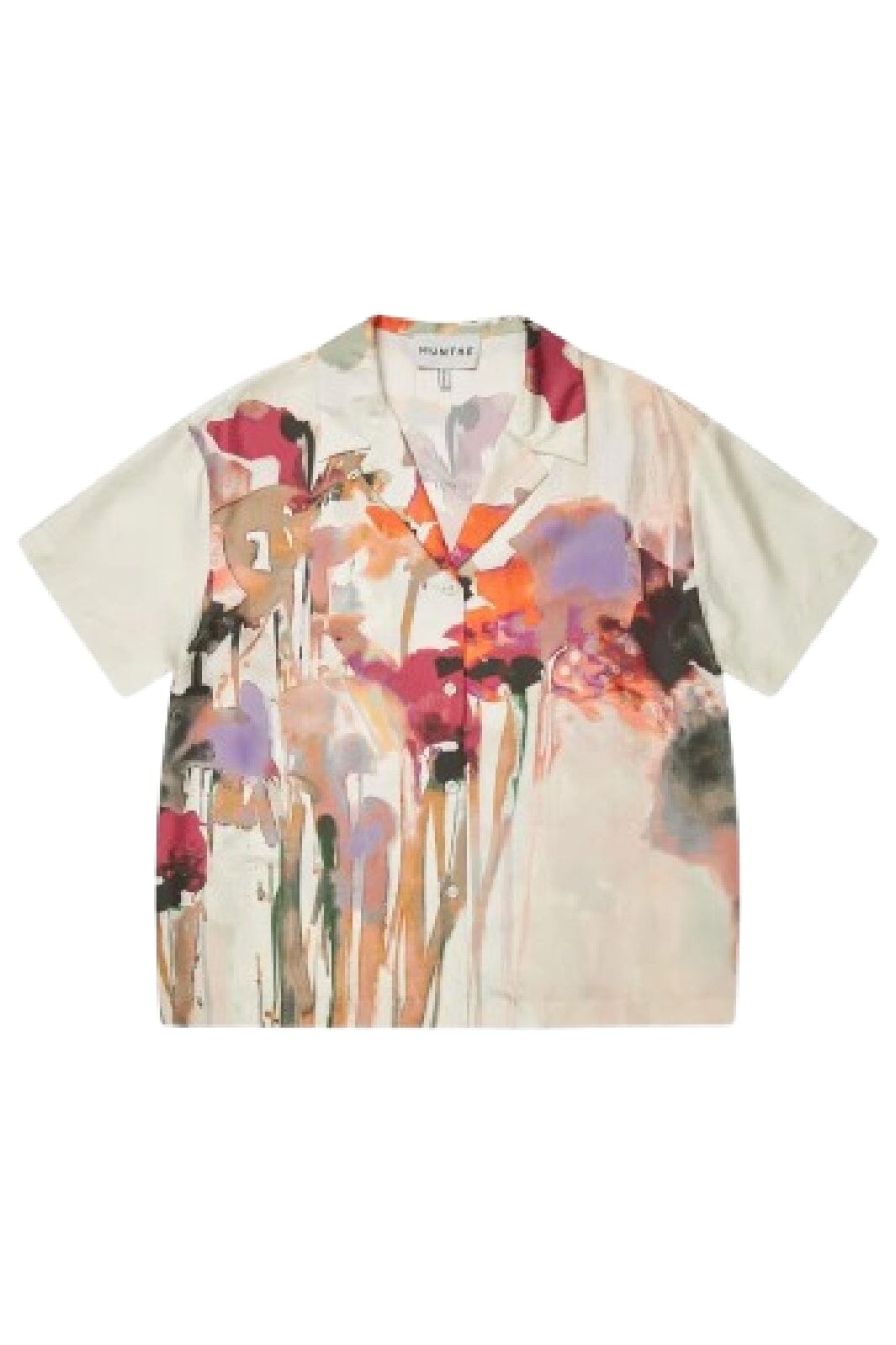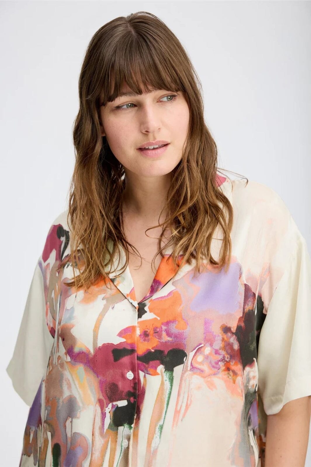 Sandkleurige blouse van Munthe met artistiek bloemenprint in roze, oranje en paarse tinten. De blouse heeft een losse pasvorm en is gemaakt van zijde met korte mouwen en een klassieke kraag.