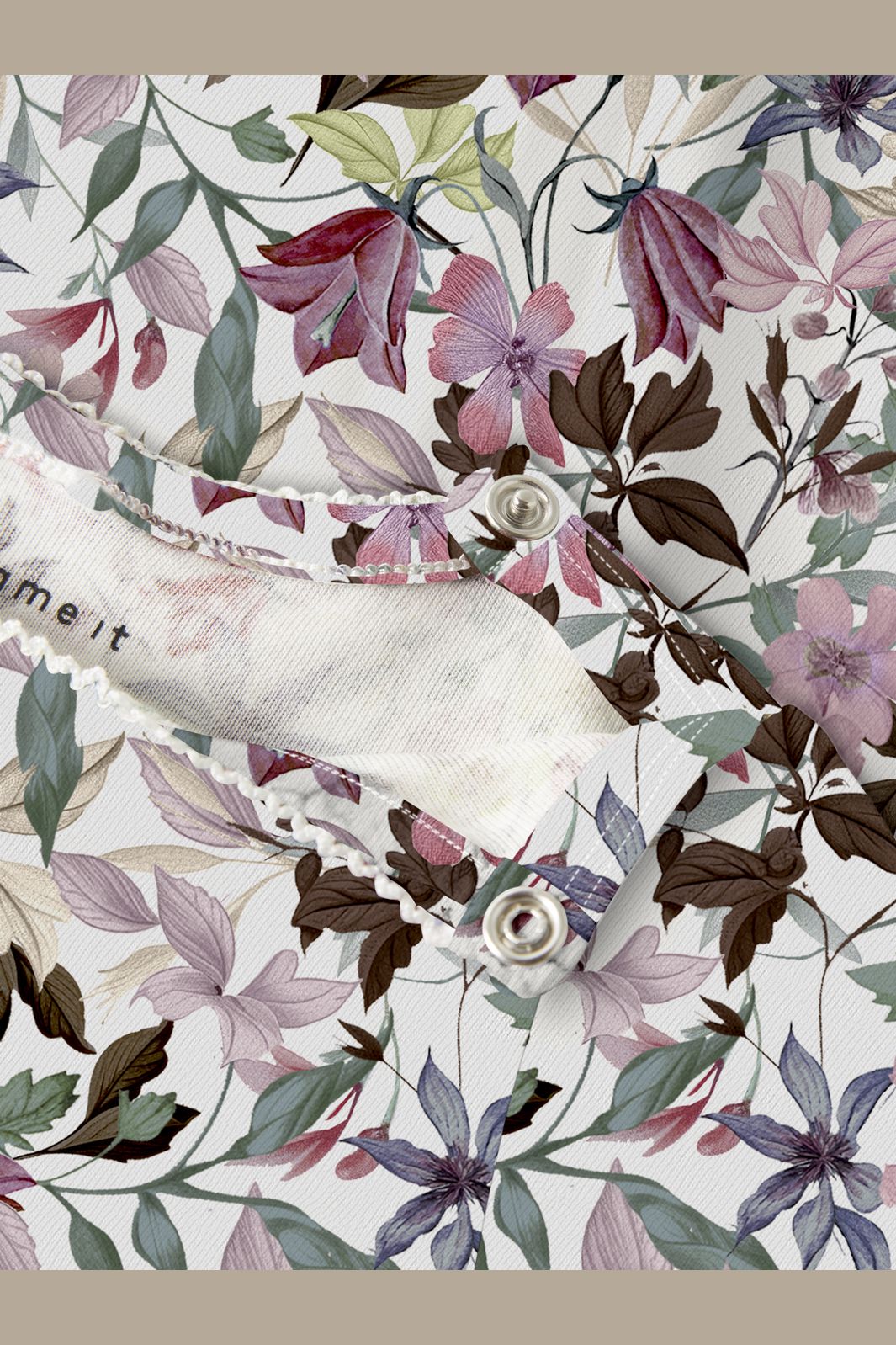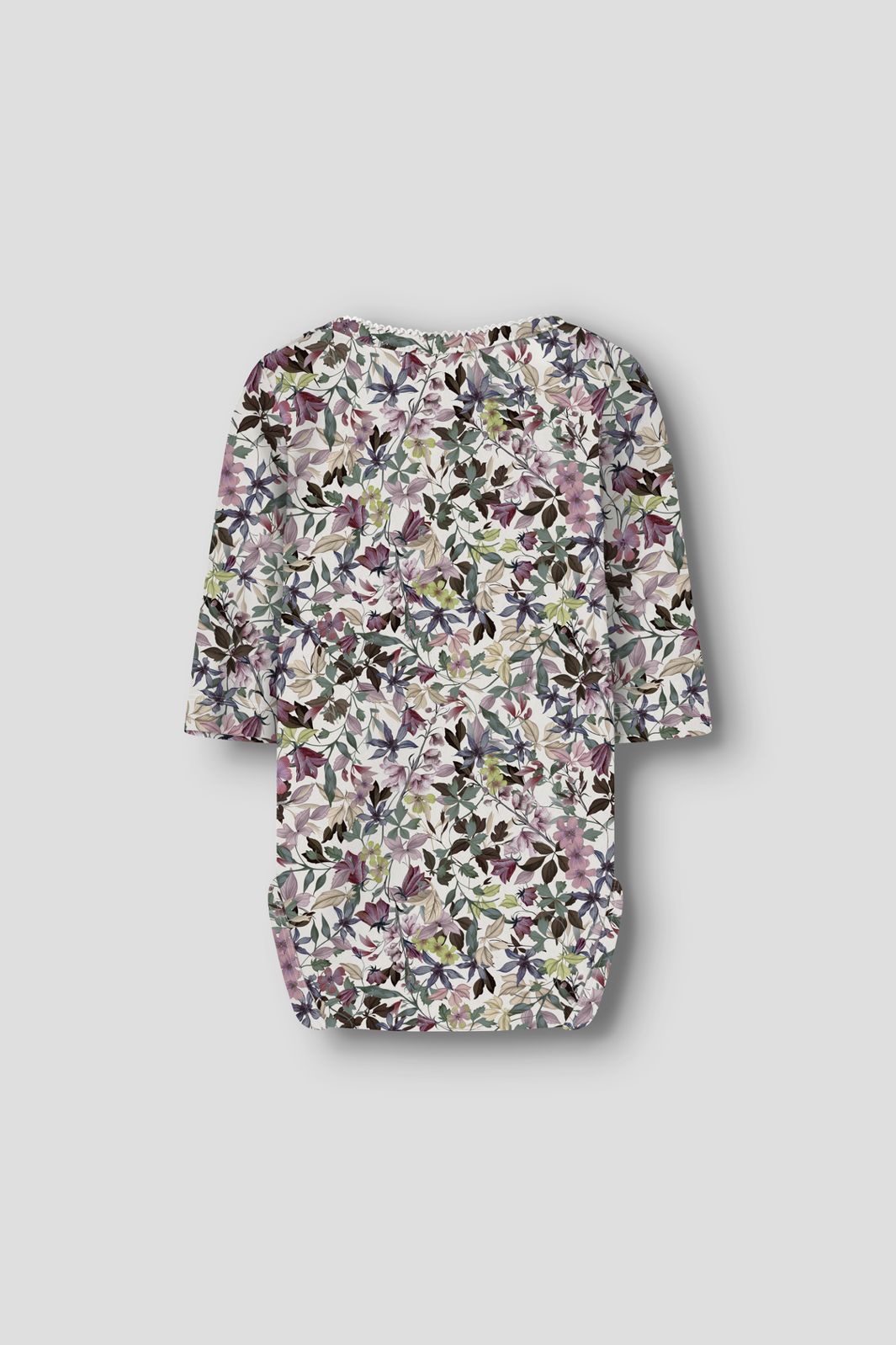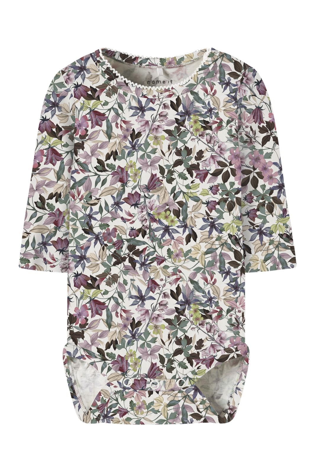 Langarmige body van Name It met een bloemenpatroon in groene, crèmekleurige, witte en paarse tinten. De zachte jersey heeft een ronde halslijn met drukknoopjes.