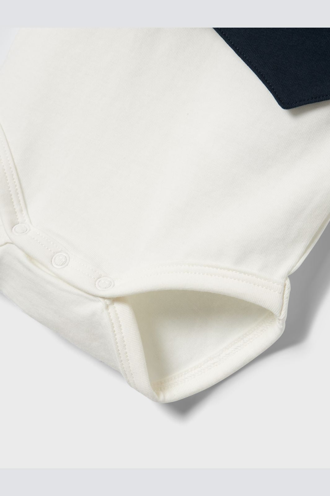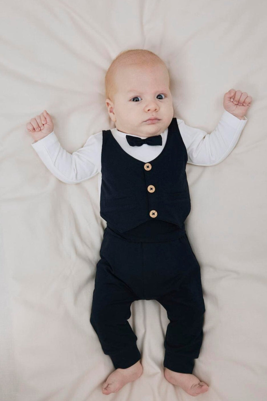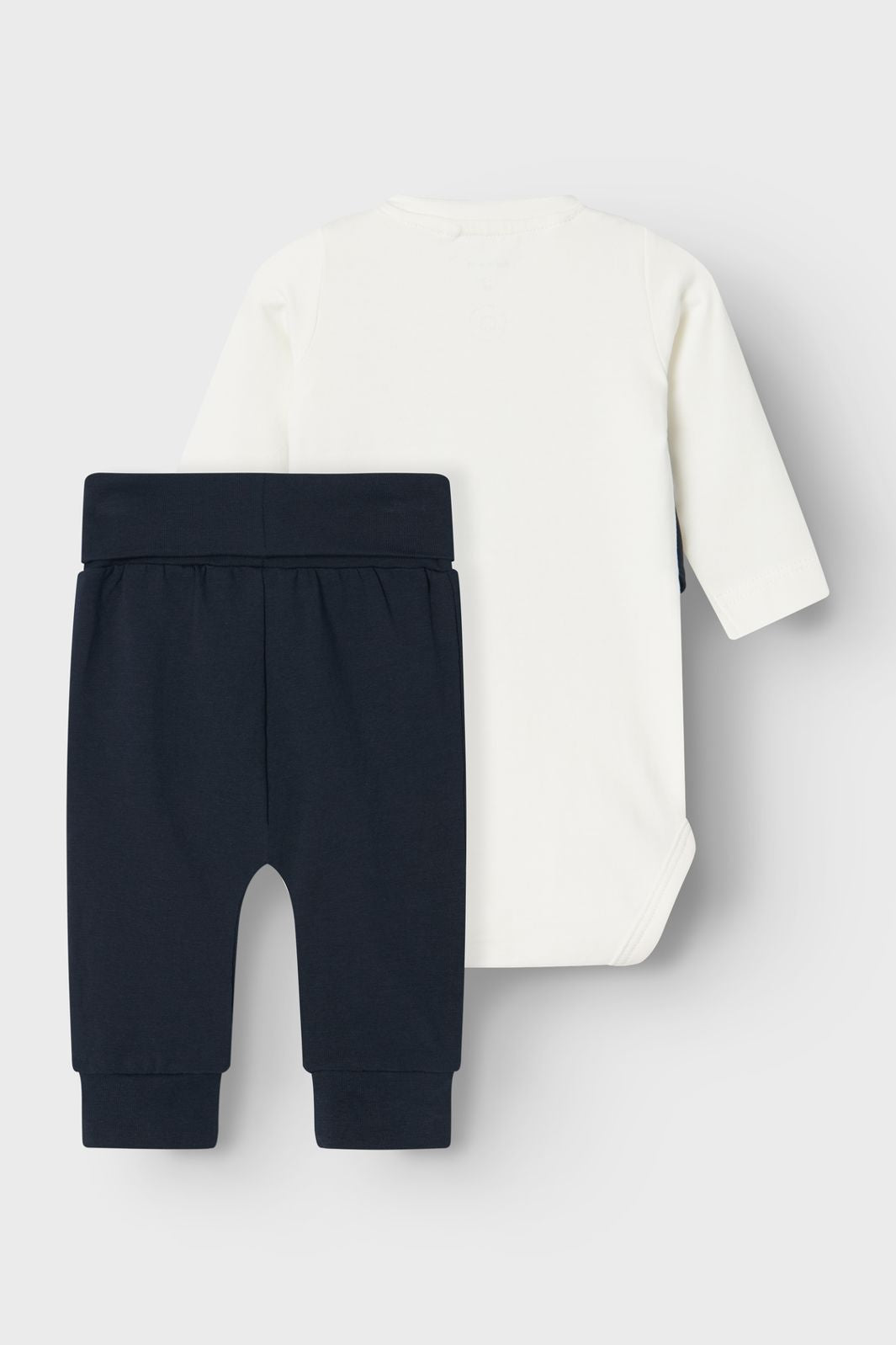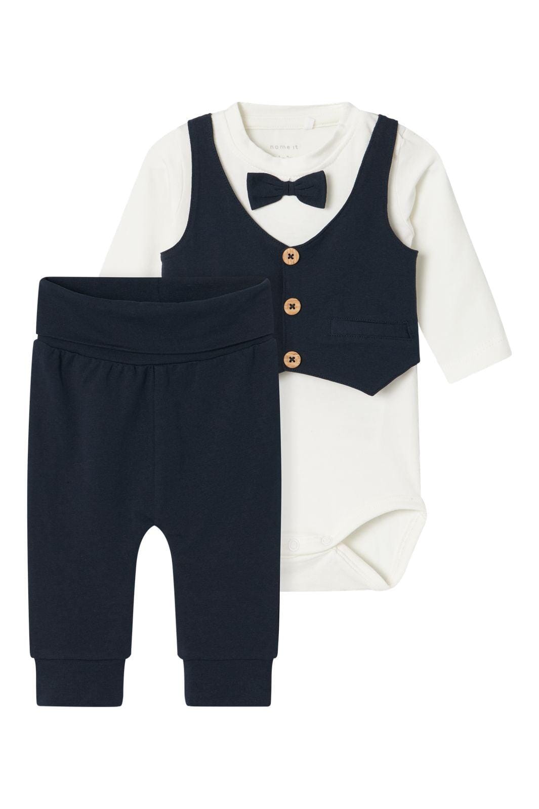 Bodyset van Name It met een witte body en een donkerblauw vest. Het setje heeft lange mouwen, een ronde hals en een strikdetail. Het vest heeft bruine knopen en de broek heeft een elastische taille.
