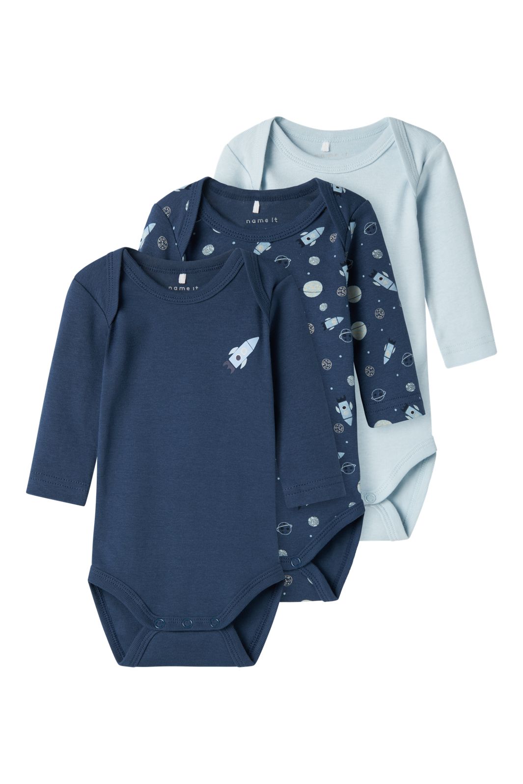 Lange mouwen body van Name It in donkerblauw met ruimtethema. De body is ook verkrijgbaar in effen lichtblauw. Beide varianten hebben een print met raketten en planeten of een effen ontwerp.
