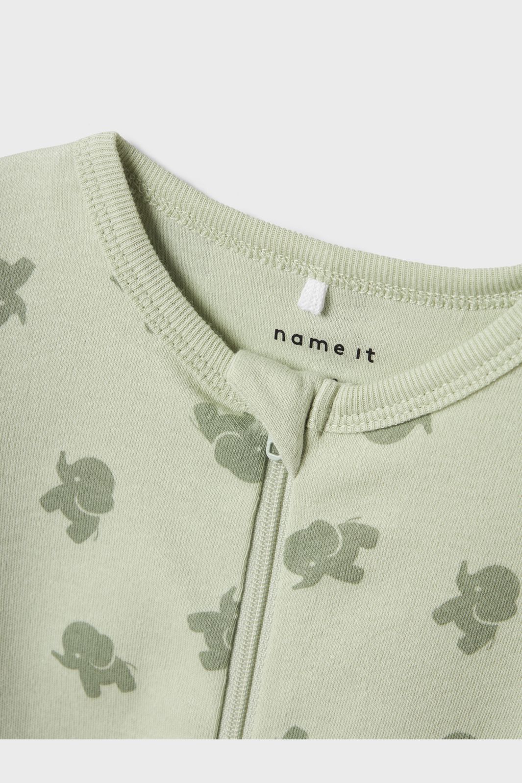Pyjama onesie van Name It in lichtgroene kleur met olifantenprint. Het pak heeft een ritssluiting van hals tot pijp en is gemaakt van een mix van biologische en gewone katoen.