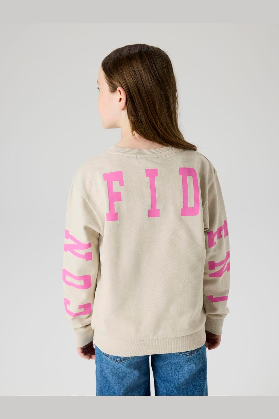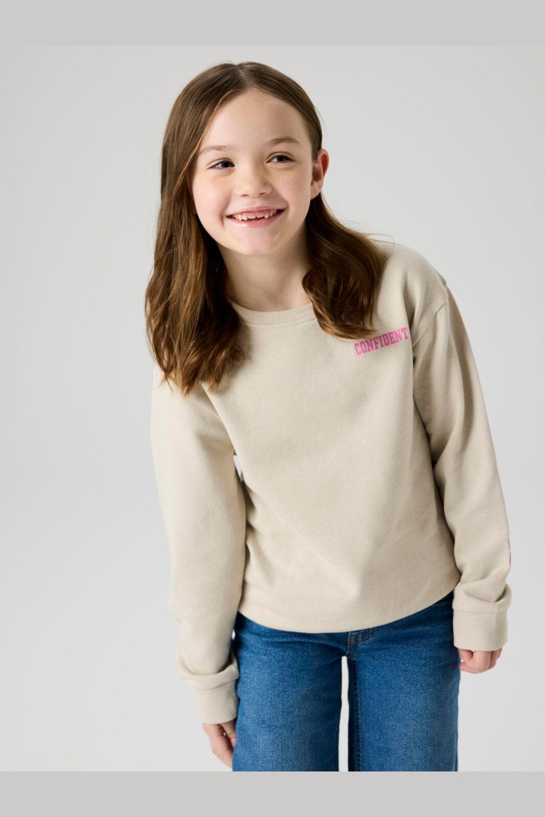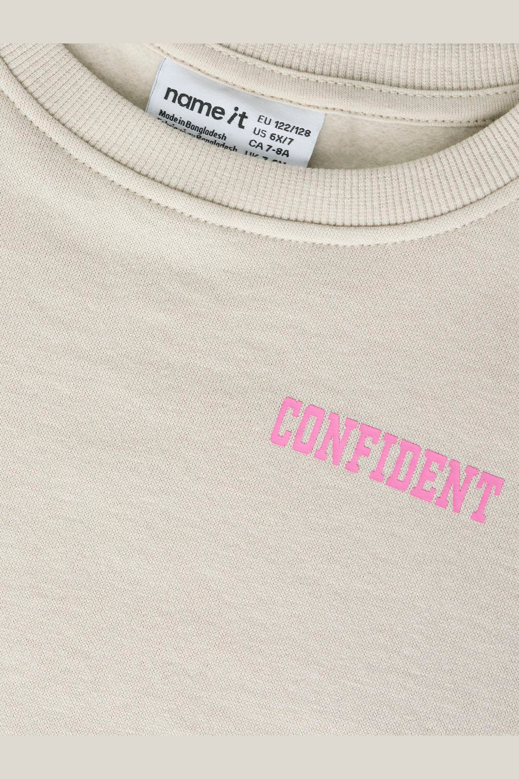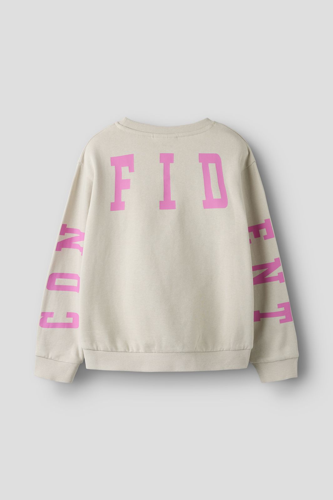 Sweatshirt van Name It in lichtgrijs met roze CONFIDENT-print op de voor- en achterkant. De sweatshirt heeft een ronde hals en ribboorden bij de mouwen.