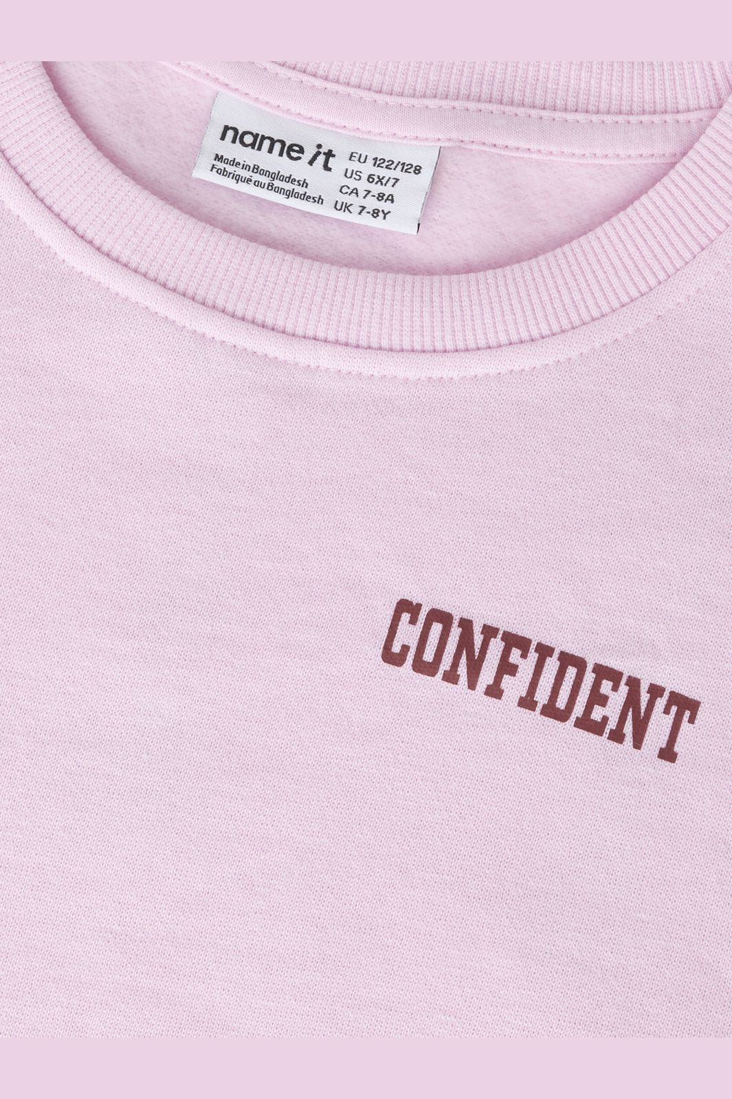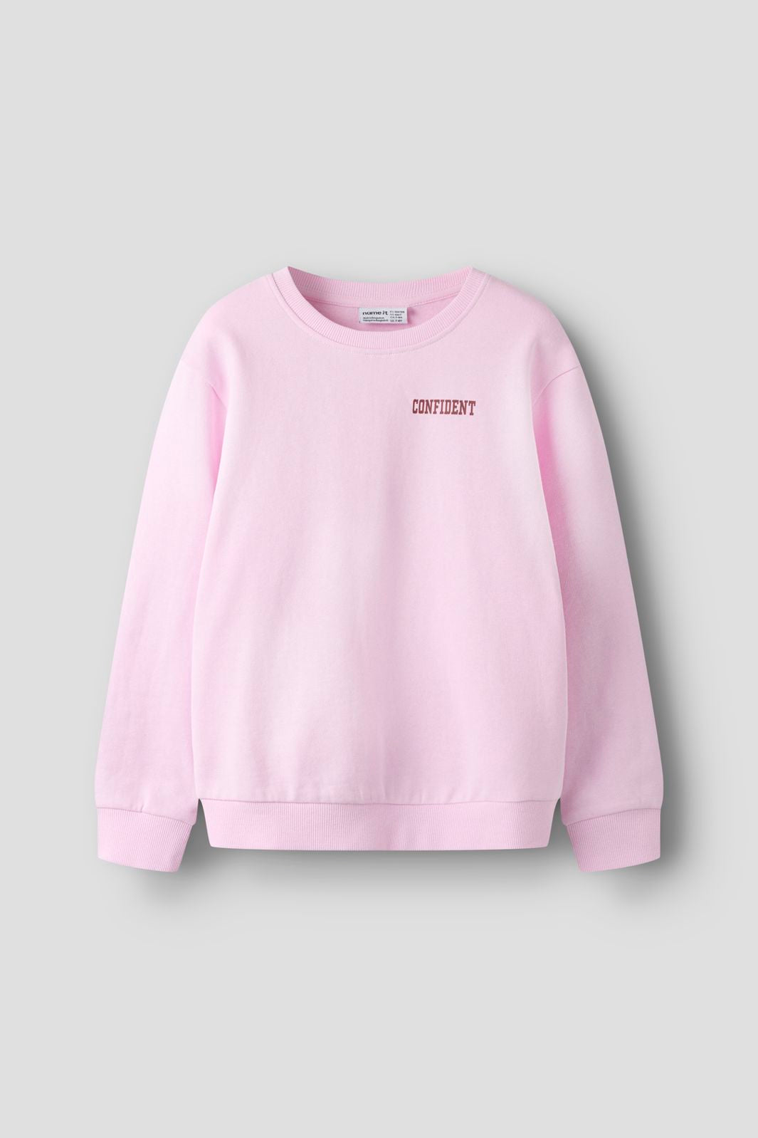Roze sweatshirt van Name It met de tekst CONFIDENT op de voor- en achterkant. De sweatshirt heeft een ronde hals en lange mouwen.