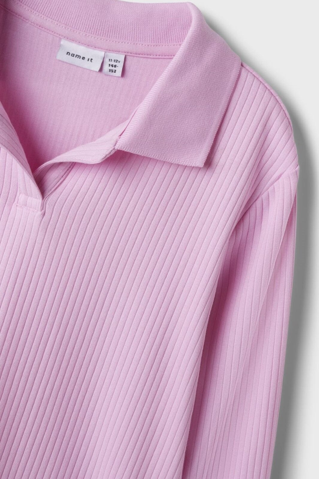 Roze polo van Name It in ribbelstof met verticale strepen. De polo heeft een klassieke polokraag en lange mouwen met een regular fit.