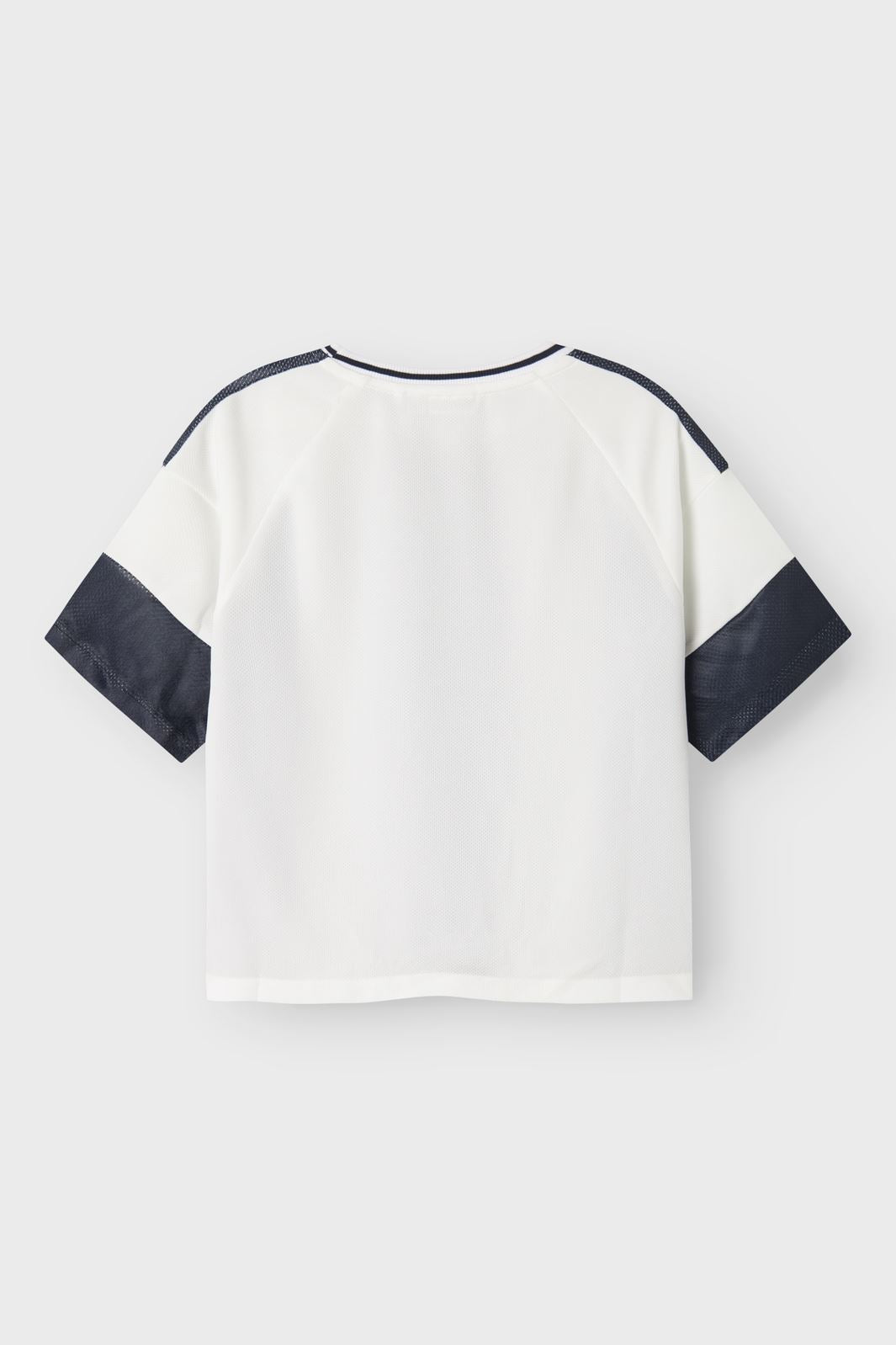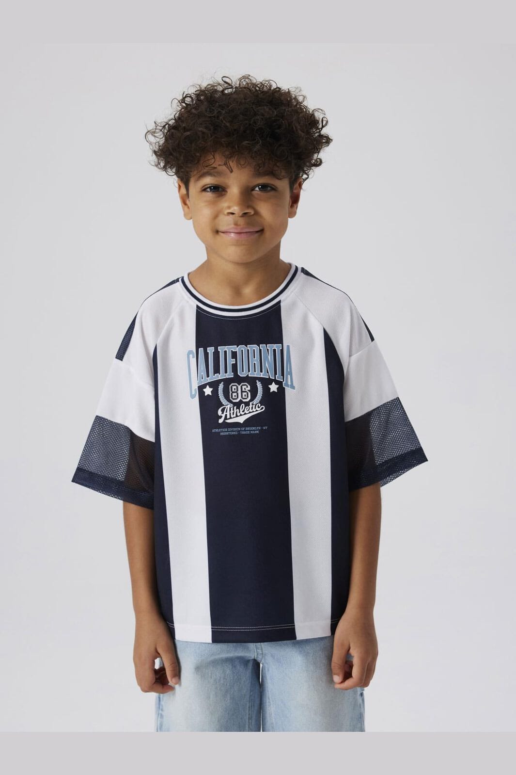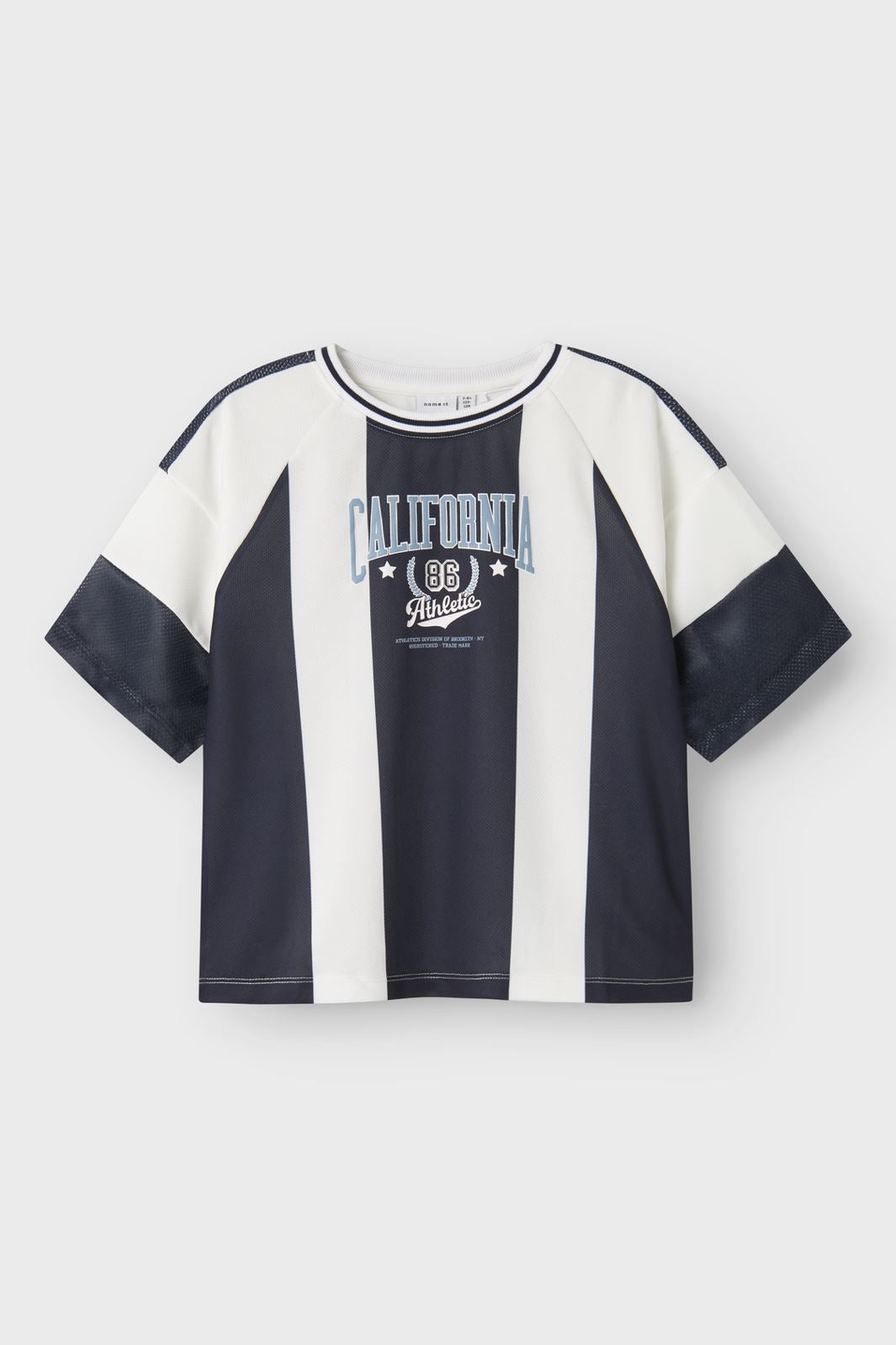 Korte mouw top van Name It met strepen in donkerblauw en wit. Het heeft een California Athletic-print op de voorkant en mesh-details bij de mouwen.