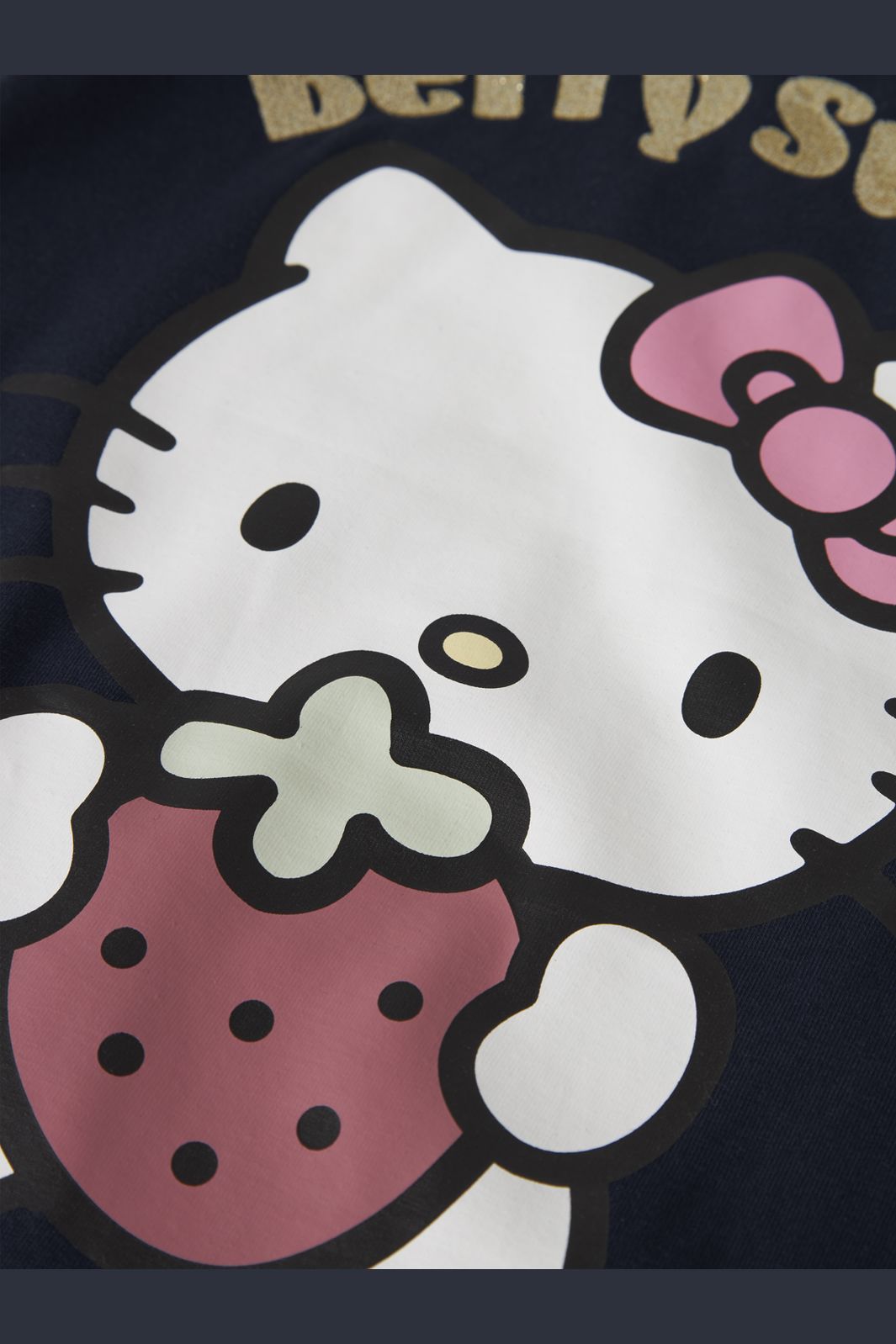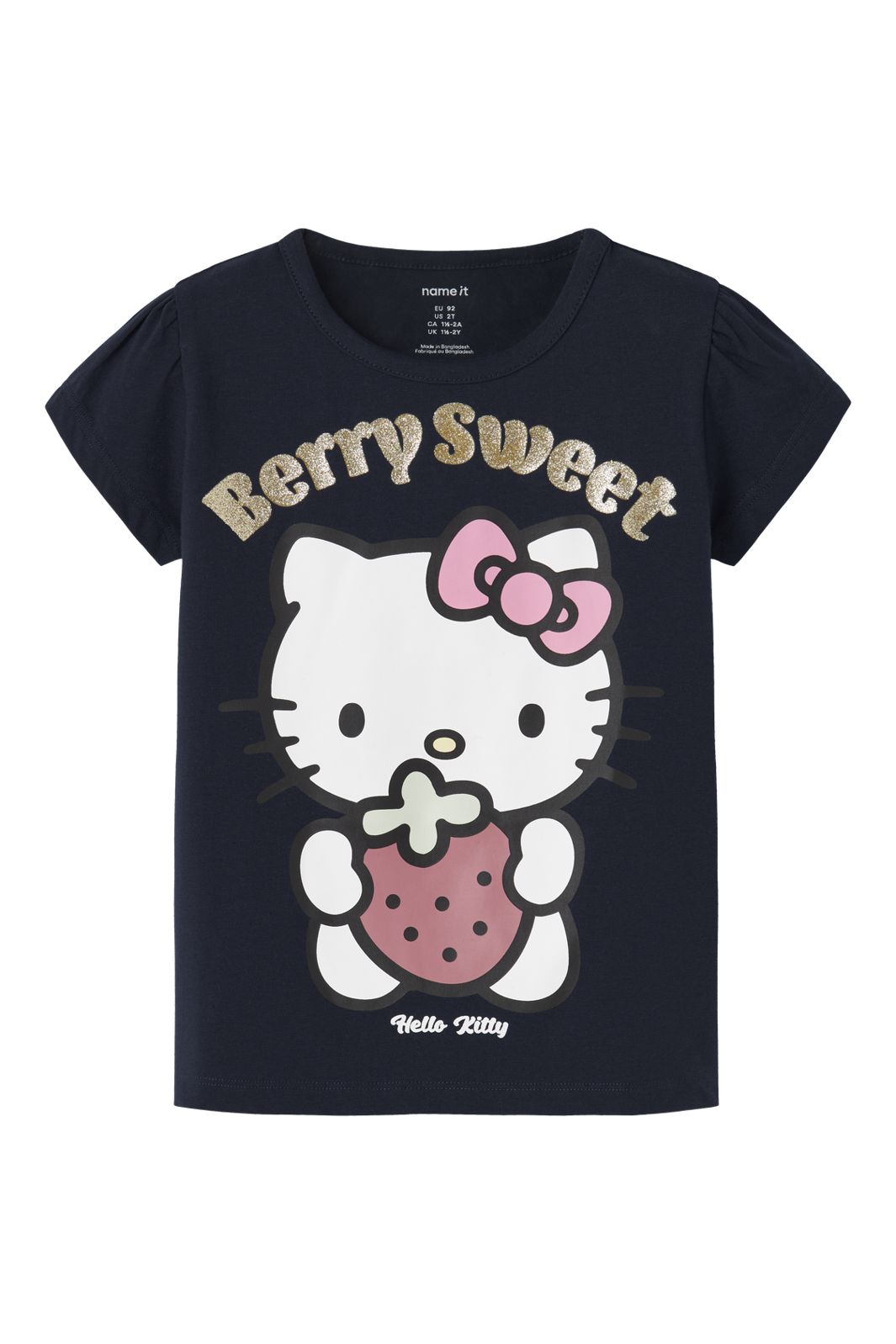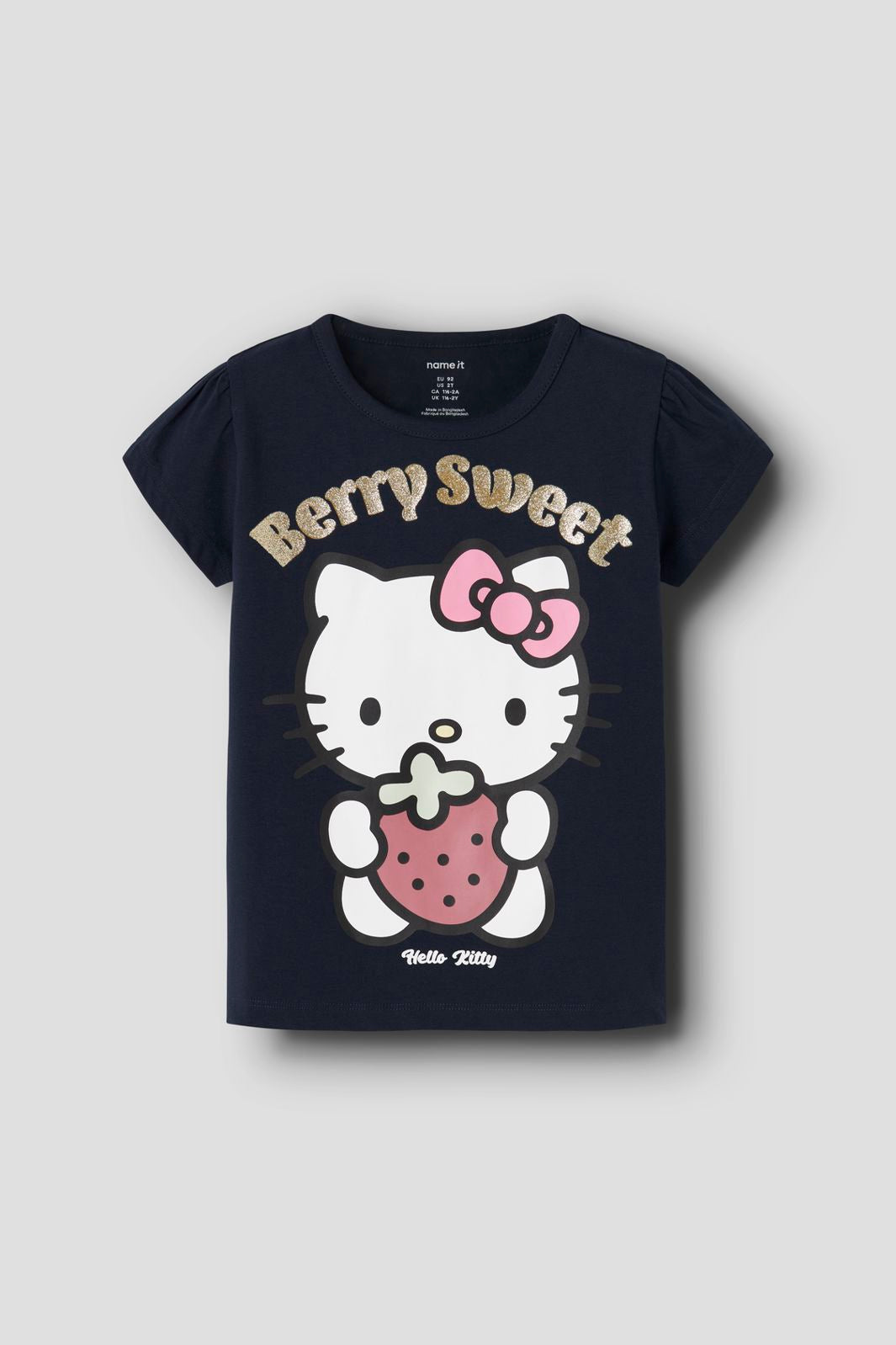 T-shirt van Name It met een Hello Kitty-motief op de voorkant. De tekst Berry Sweet staat boven het motief. De T-shirt is donkerblauw en heeft een meerkleurig design met decoratieve details.