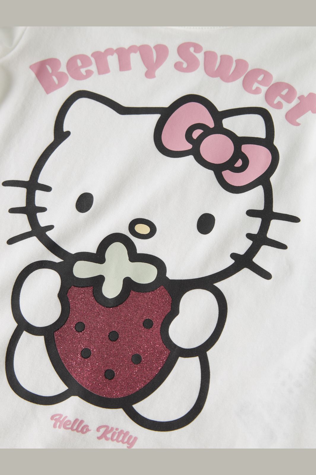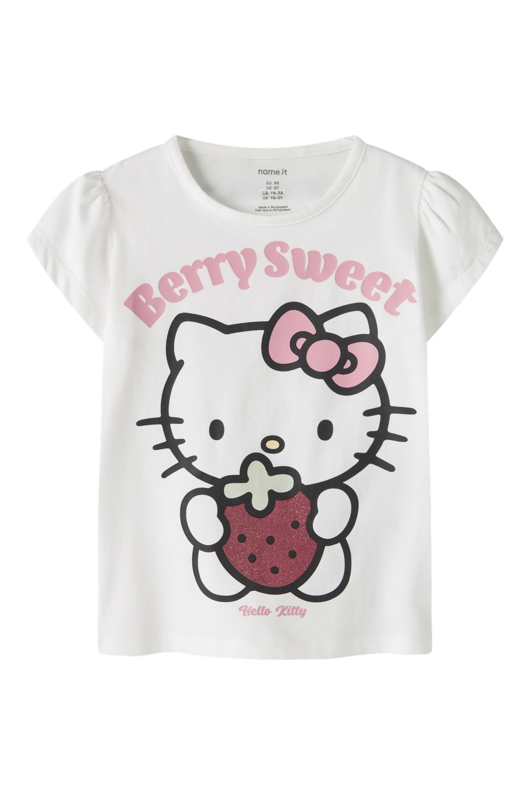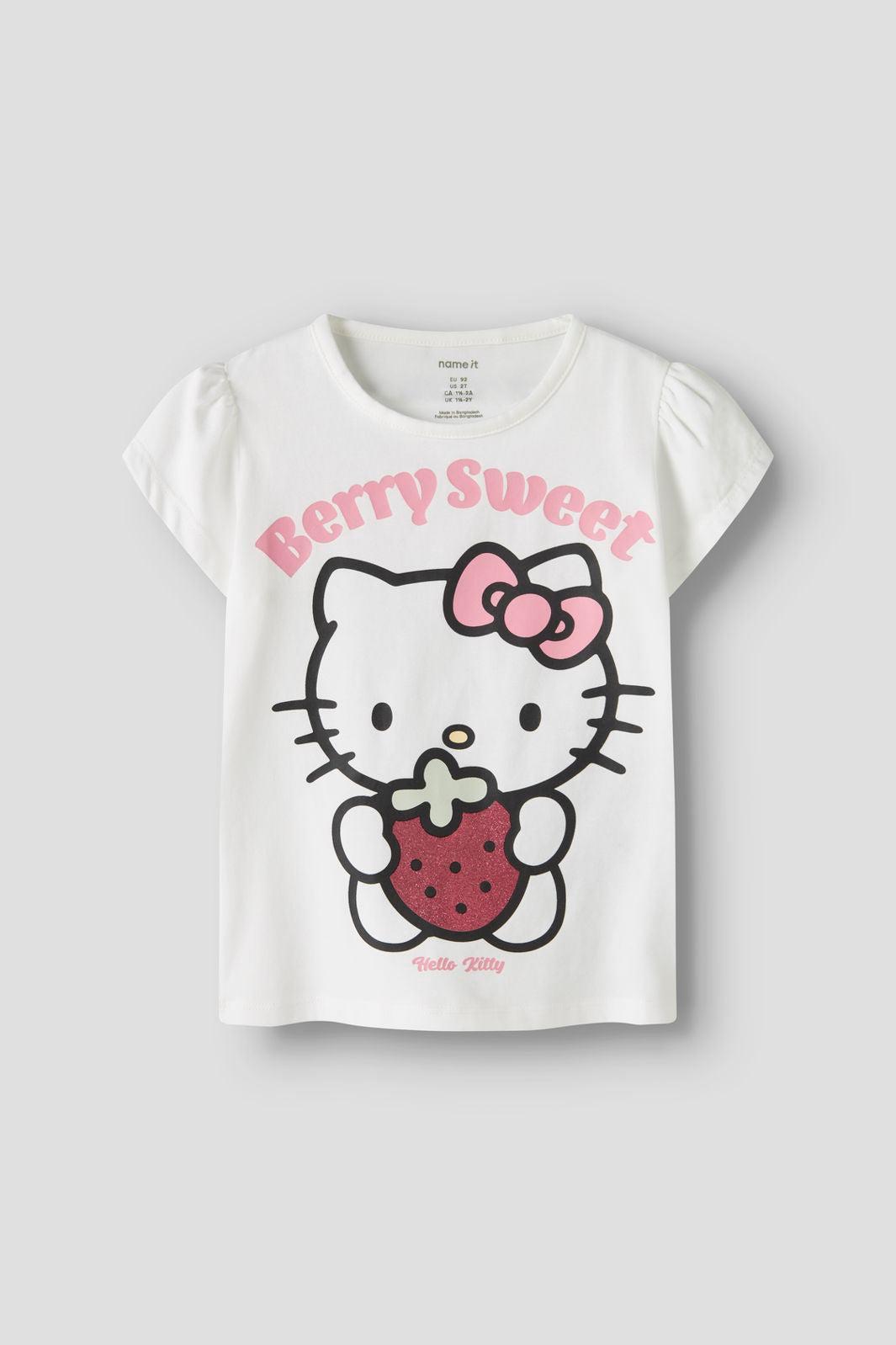 Wit T-shirt van Name It met een Hello Kitty-print waarop ze een aardbei vasthoudt. De tekst Berry Sweet staat boven het motief en het T-shirt heeft korte pofmouwen.