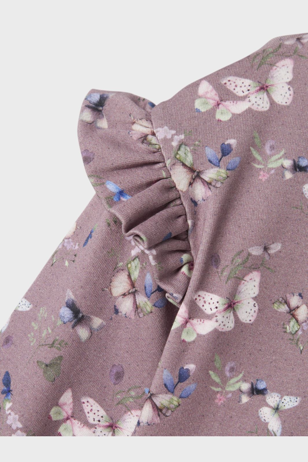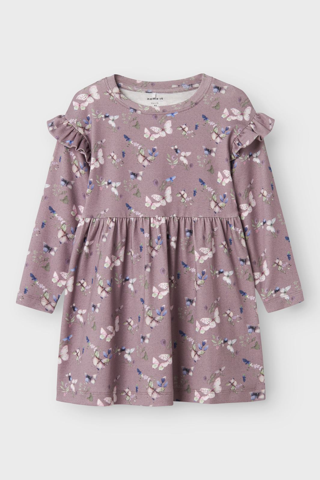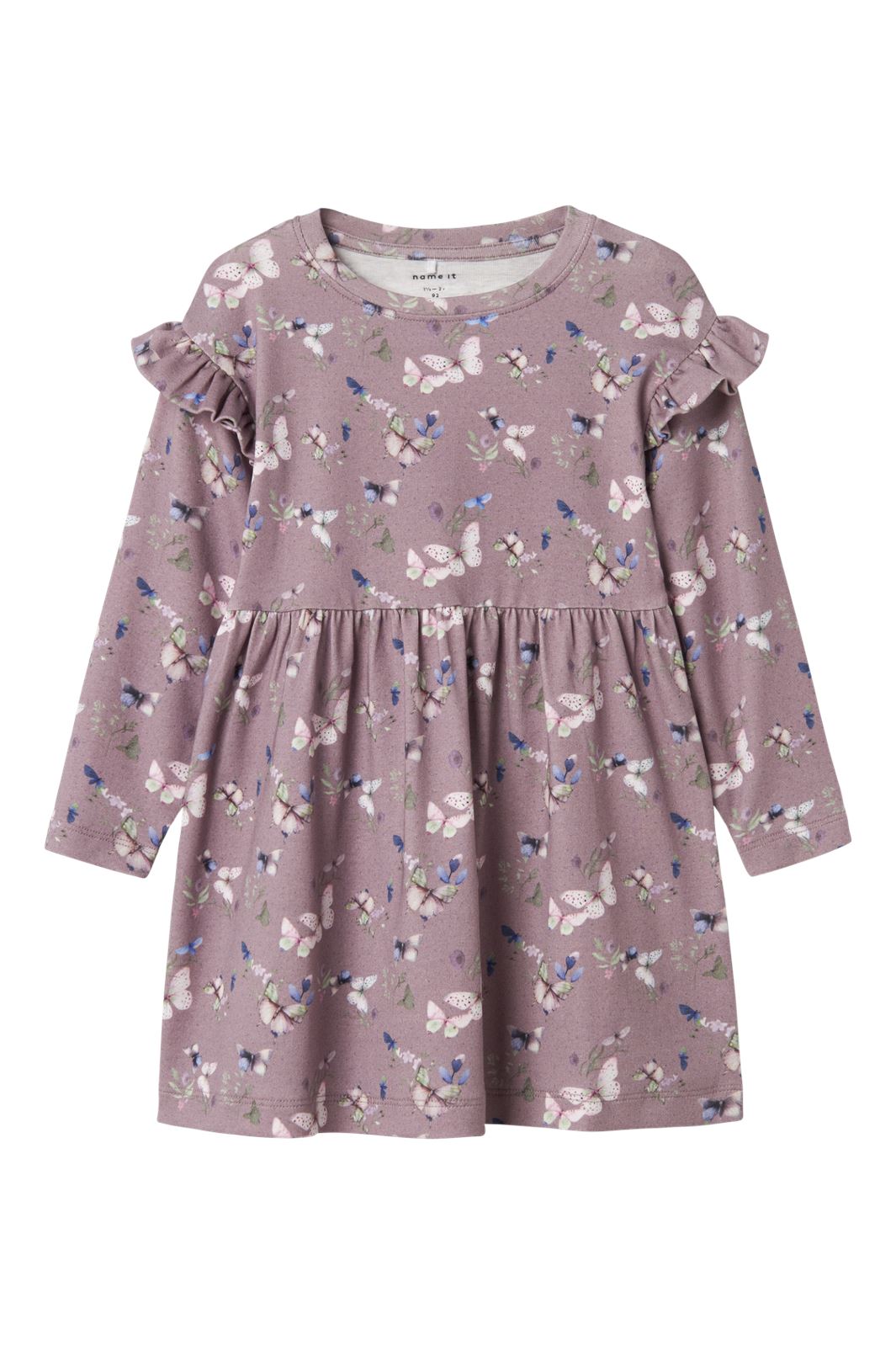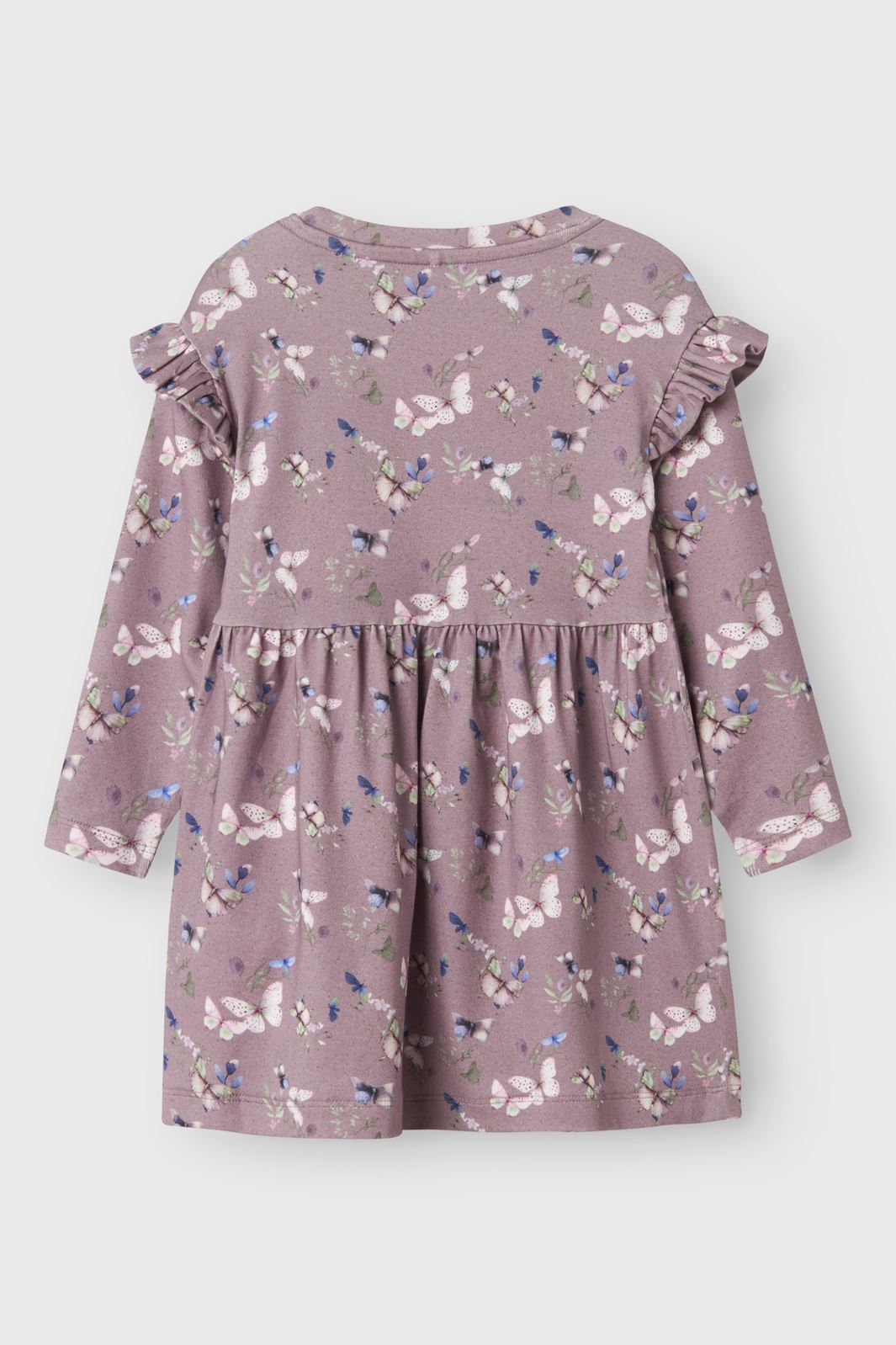 Paarse jurk met vlinder- en bloemenpatroon van Name It. De jurk heeft lange mouwen, een ronde hals en ruchesdetails bij de schouders. De knielengte biedt veel bewegingsvrijheid.