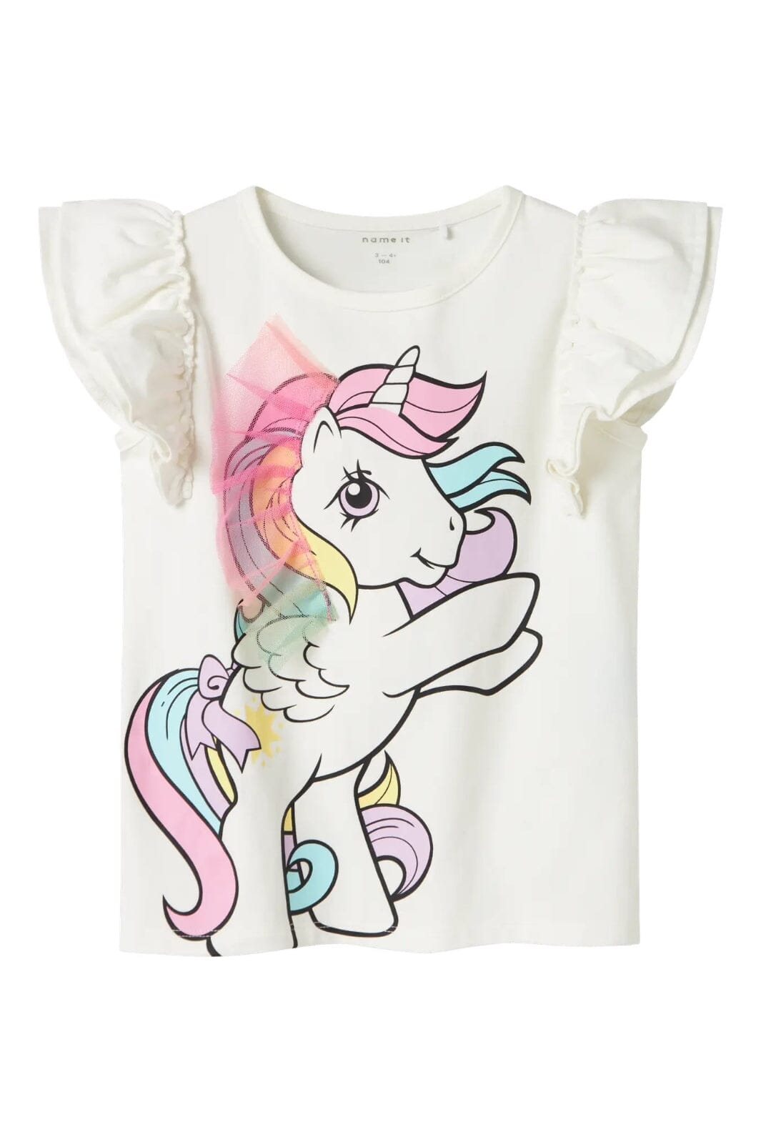 Witte t-shirt met korte mouwen van Name It. De t-shirt heeft een eenhoorn-illustratie met regenboogkleurige manen en tule-decoratie aan de voorkant. Volantmouwen en een ronde halslijn geven een mooi detail.