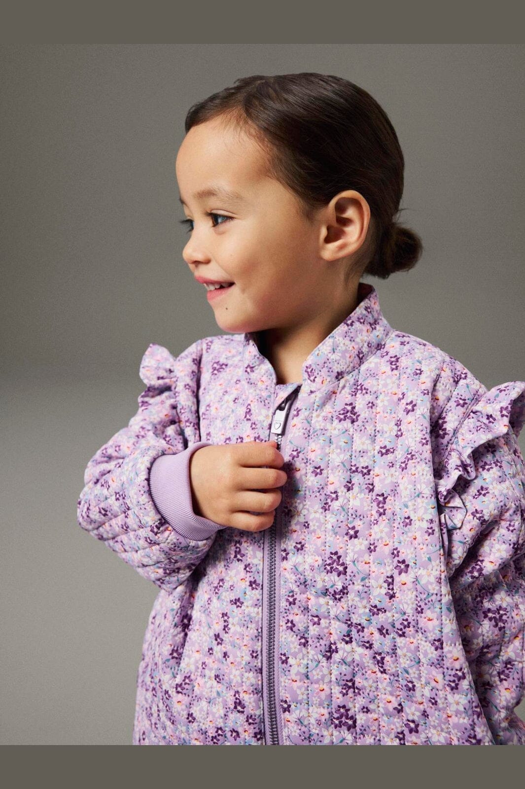 Een gewatteerde set van Name It in paarse tinten met een kleurrijke bloemenprint. Het jack heeft ruchesdetails op de schouders en een ritssluiting, terwijl de broek een elastische taille heeft.