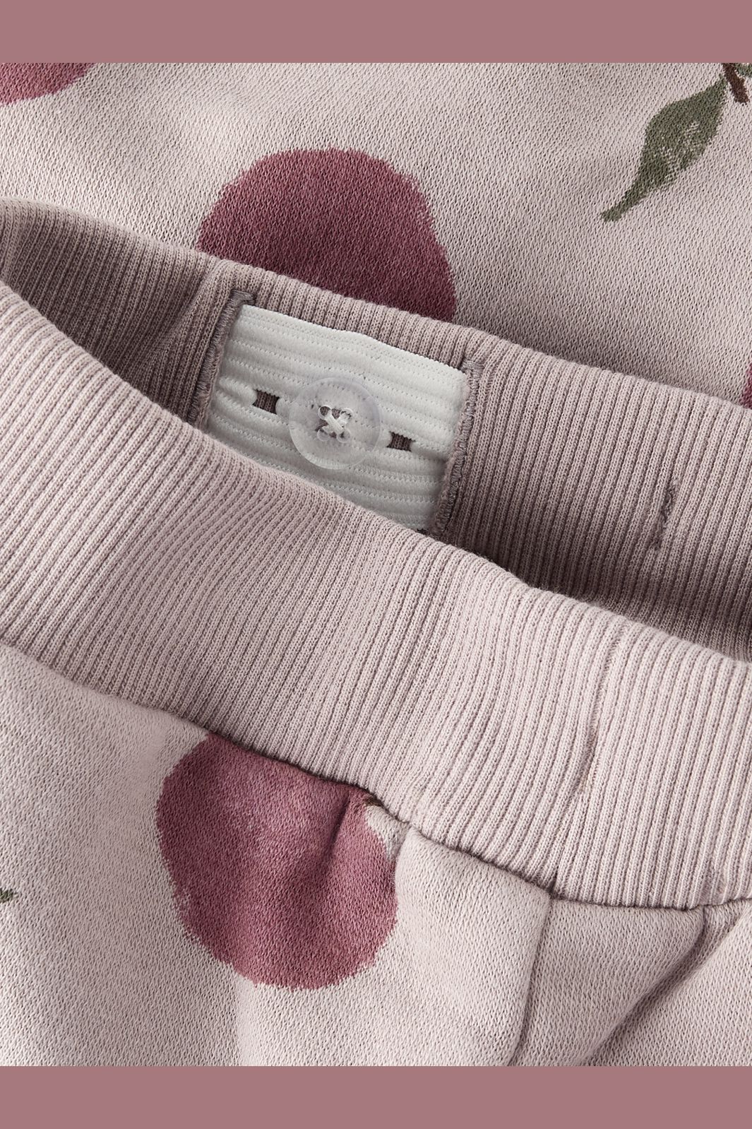 Joggingbroek van Name It in een warme beige-bruine kleur met een appelpatroon in rode en groene tinten.
