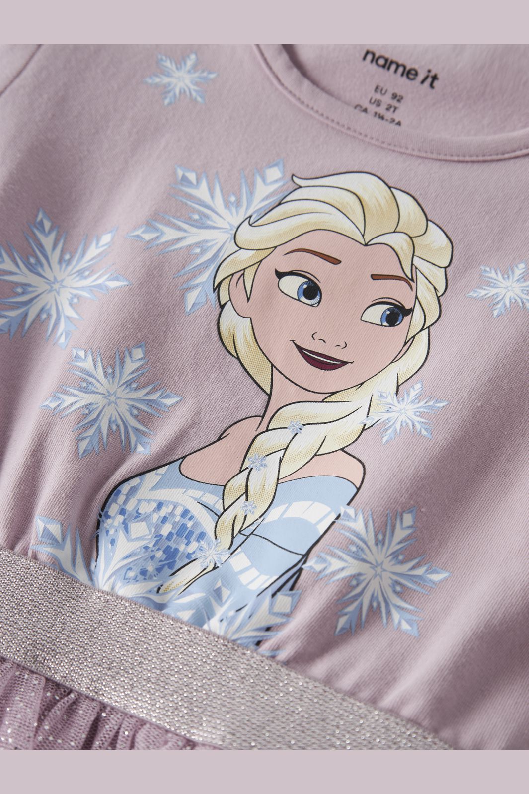Roze jurk van Name It met lange mouwen. De jurk combineert een zachte katoenen top met een schitterende tule rok en heeft een karakterprint met sneeuwvlokken op de voorkant.