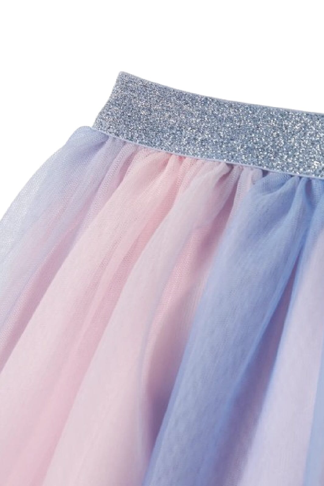 Een tule rok met gelaagd ontwerp in lichtblauw en roze. De rok heeft een glinsterend detail in de taille en ruches die beweging geven aan de zachte lagen van tule.