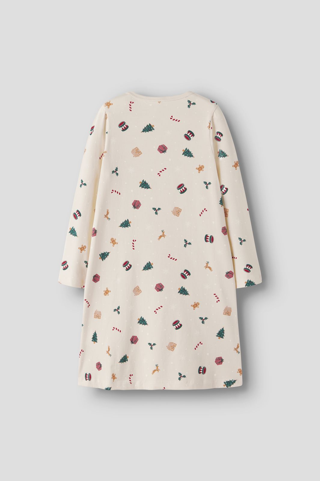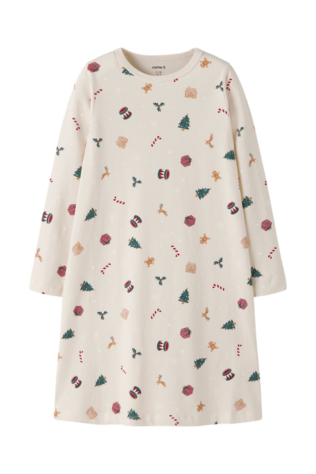 Lichtgrijze nachtjapon van Name It met een kerstthema-print van cadeautjes, kerstbomen en peperkoekmannetjes. Hij heeft een ronde halslijn en lange mouwen voor de koele nachten.