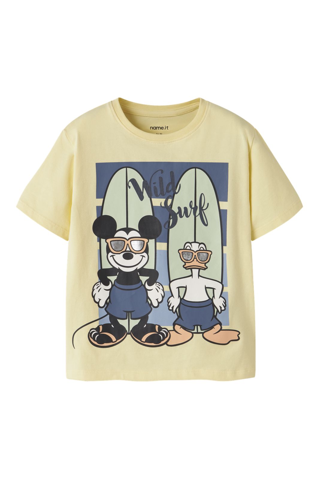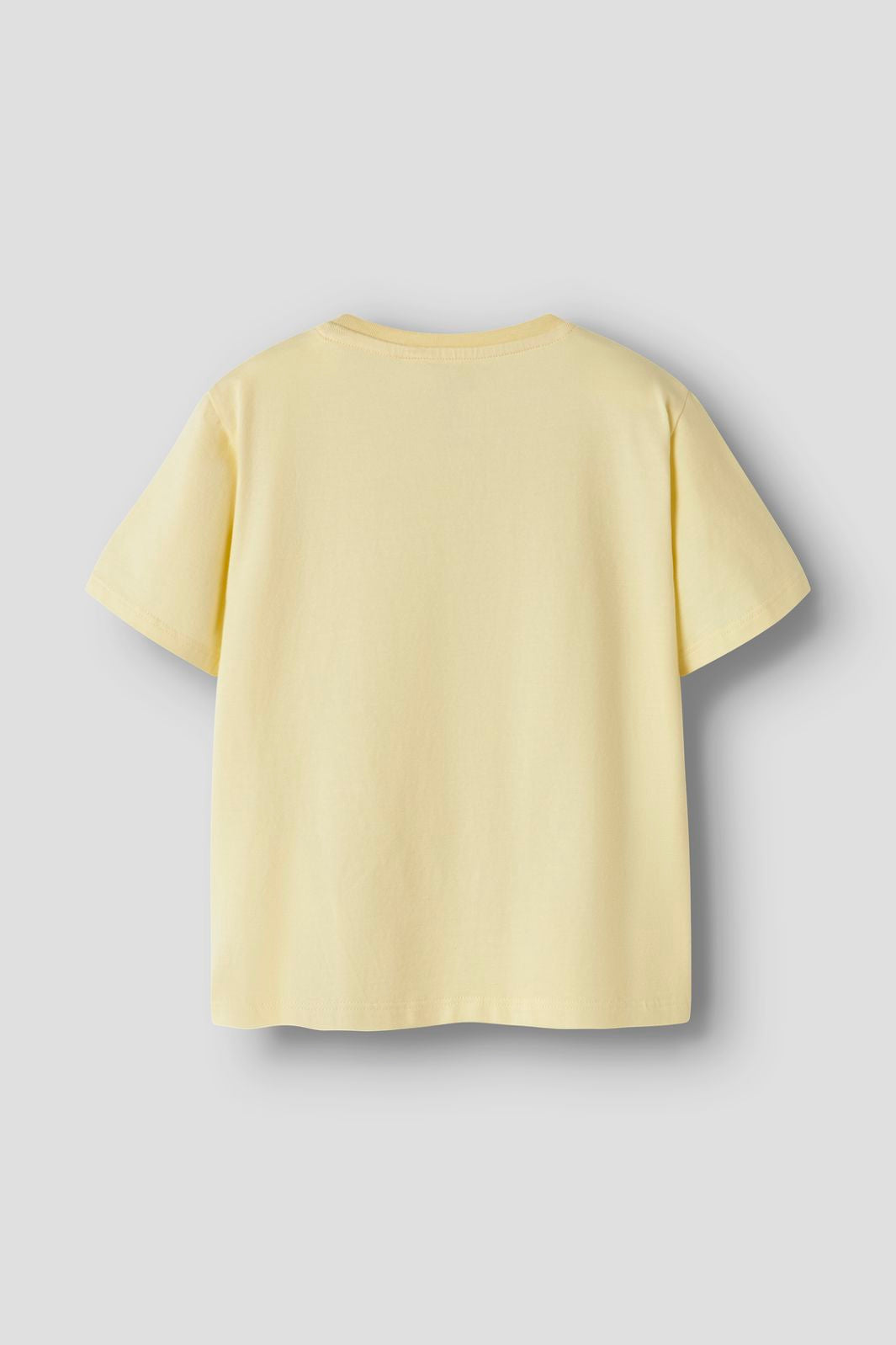 Gele t-shirt van Name It met een grafische print van figuren en surfplanken op de voorkant. De t-shirt heeft een ronde hals en korte mouwen in een lichte crèmekleurige tint.