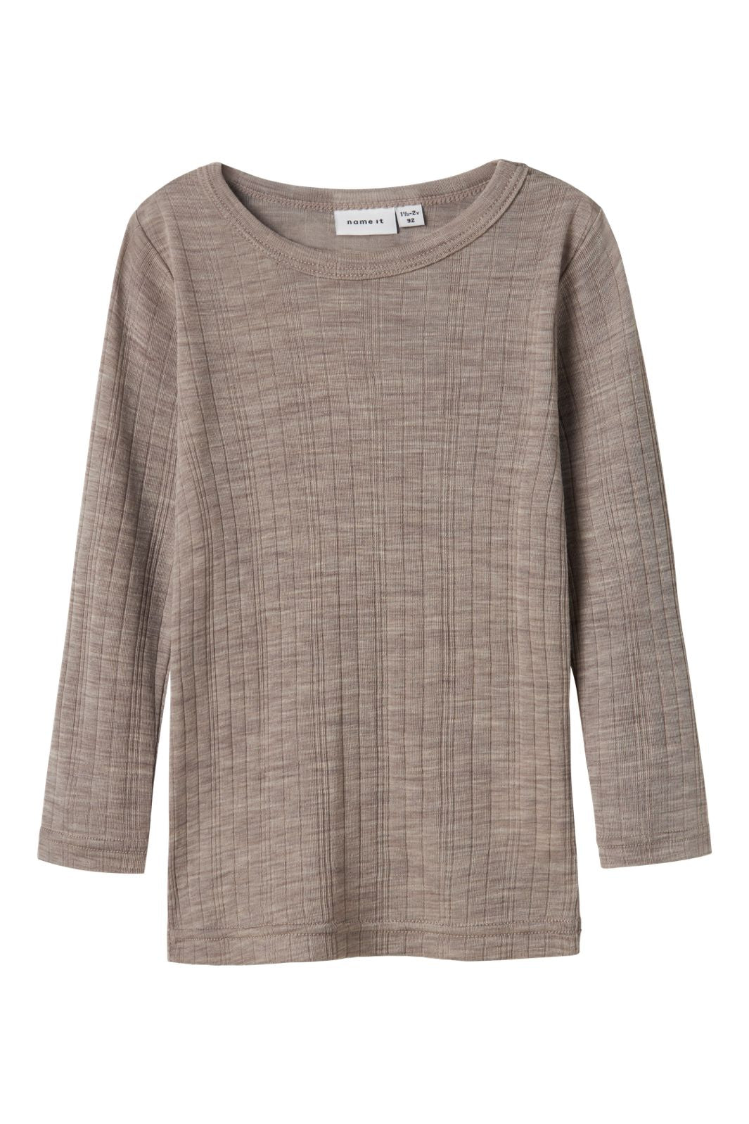 Bruin langarmige top van Name It met verticale strepen in de stof. De top heeft een ronde halslijn en is gemaakt met needle drop-techniek, wat een gestructureerd patroon in de stof geeft.