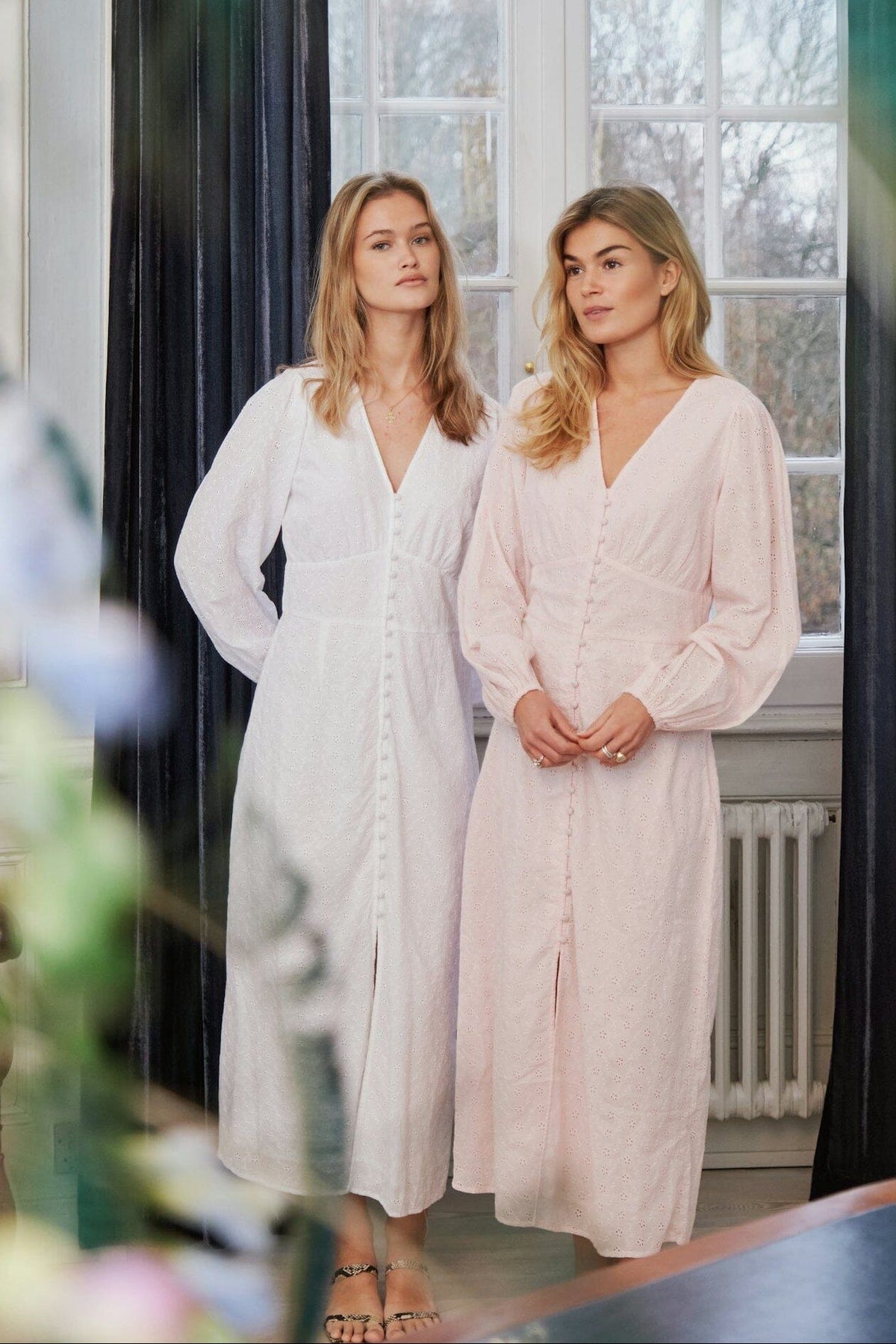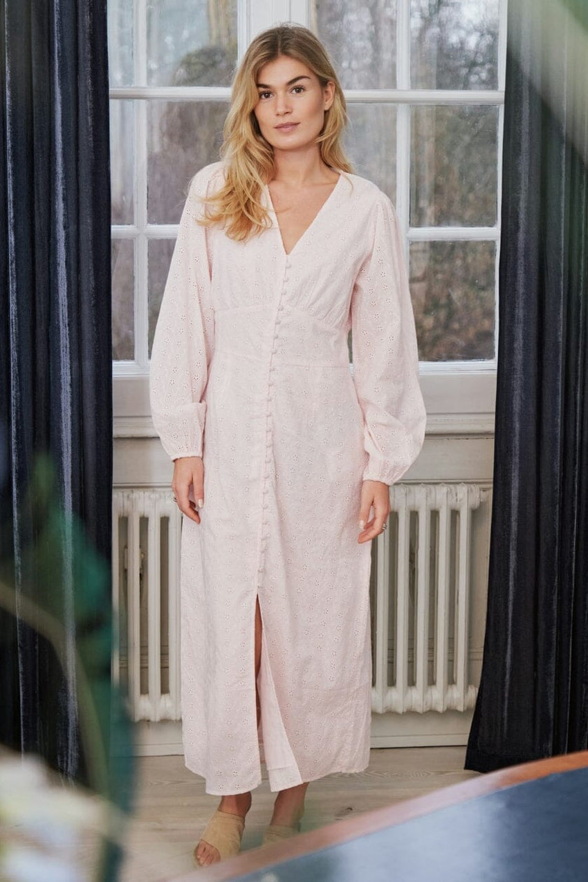 Roze jurk van Neo Noir, gemaakt van 100% katoen in broderie anglaise-kwaliteit. De jurk heeft een doorlopend geborduurd patroon met V-hals.
