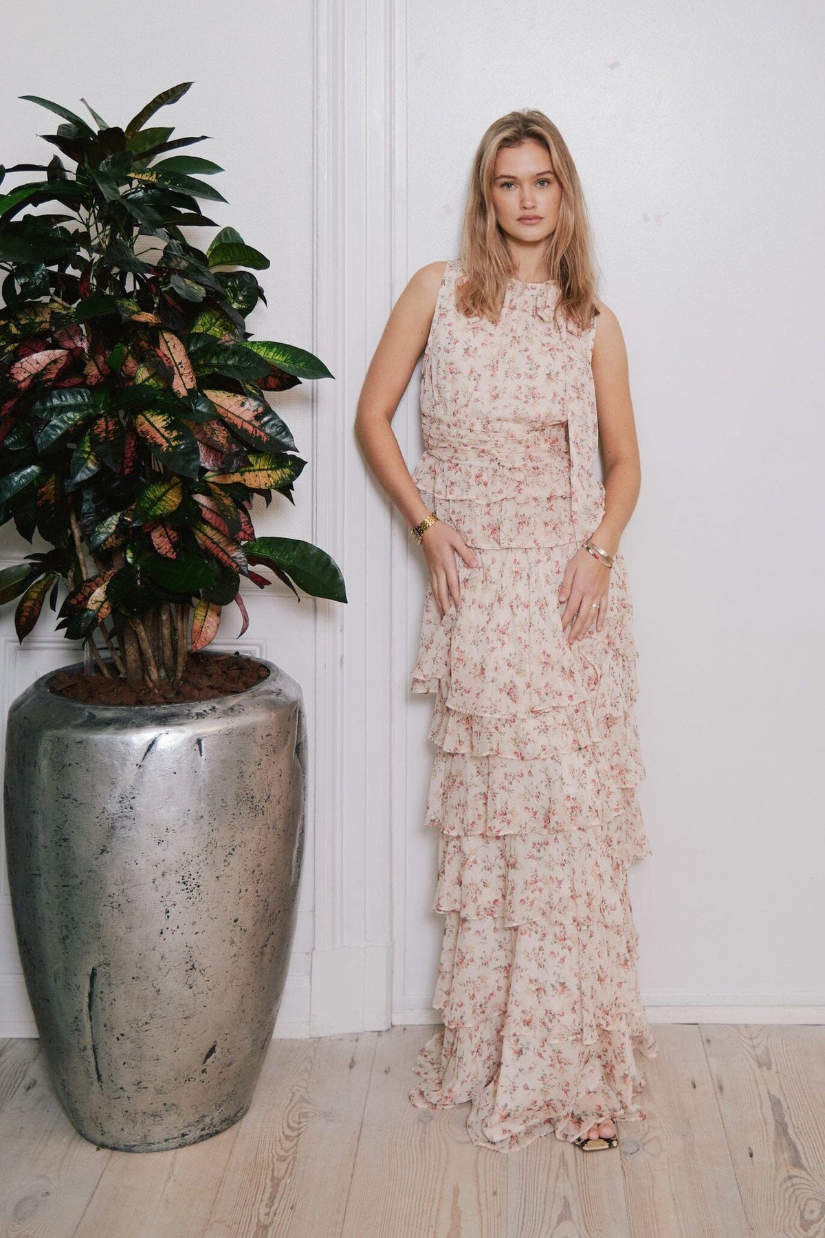 Mouwloze top van Neo Noir met bloemenprint in roze en groene tinten op een crèmekleurige achtergrond. De top heeft een hoge hals en een smalle pasvorm.
