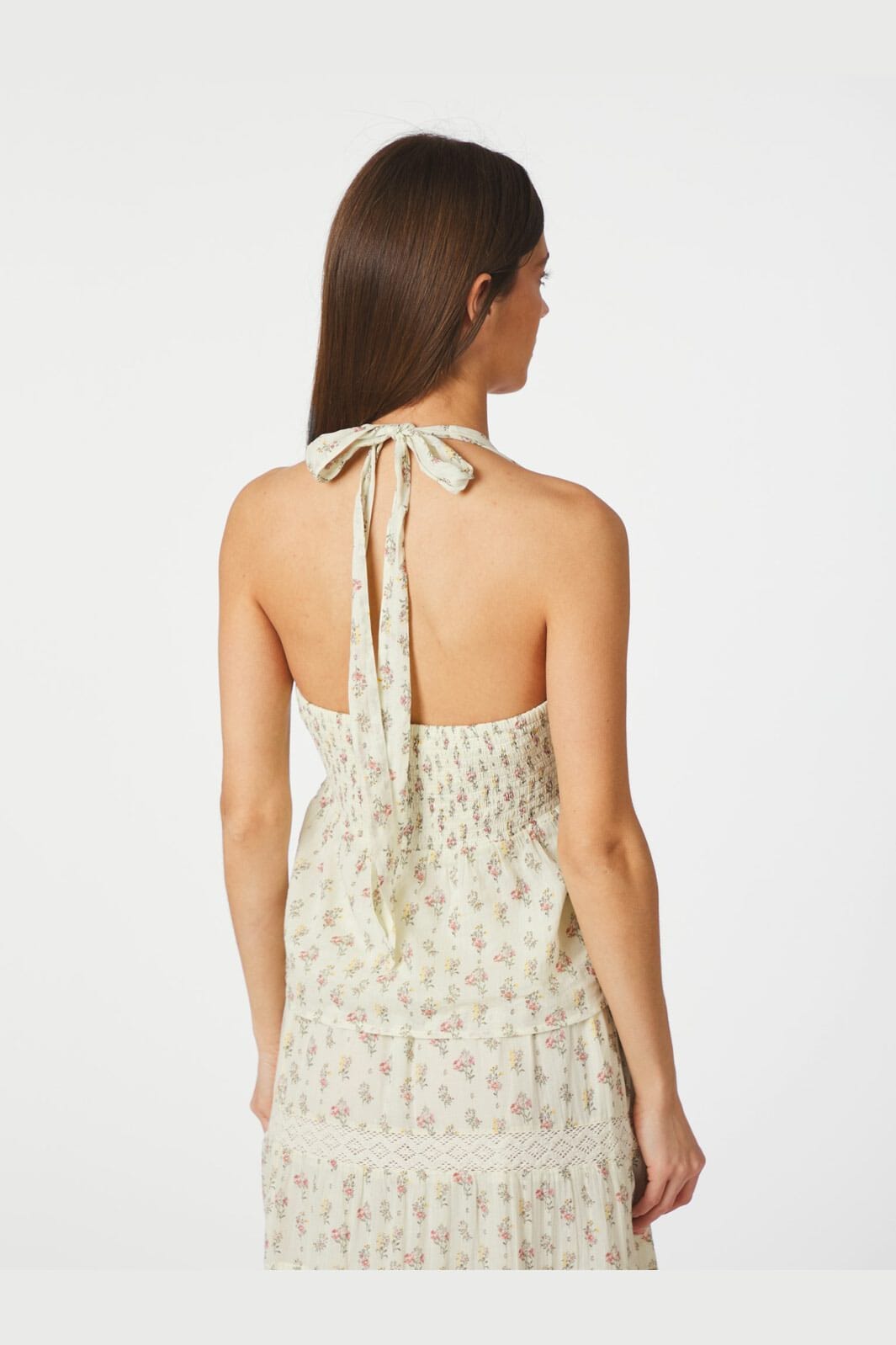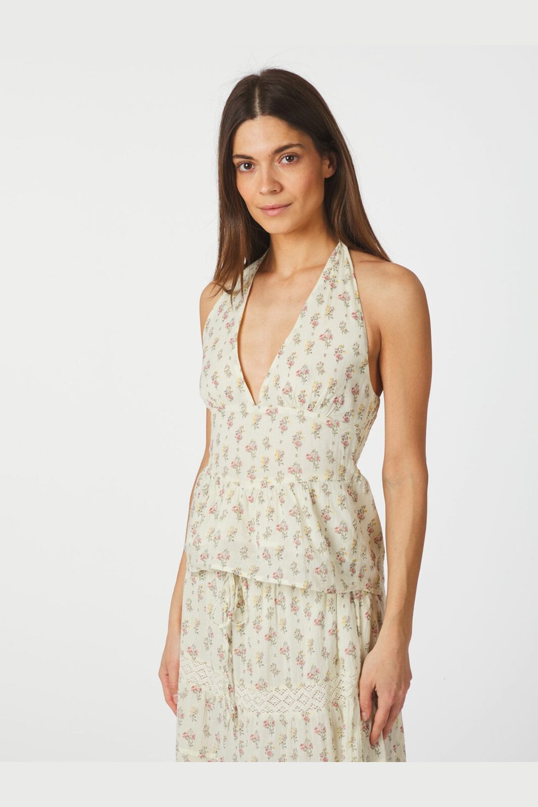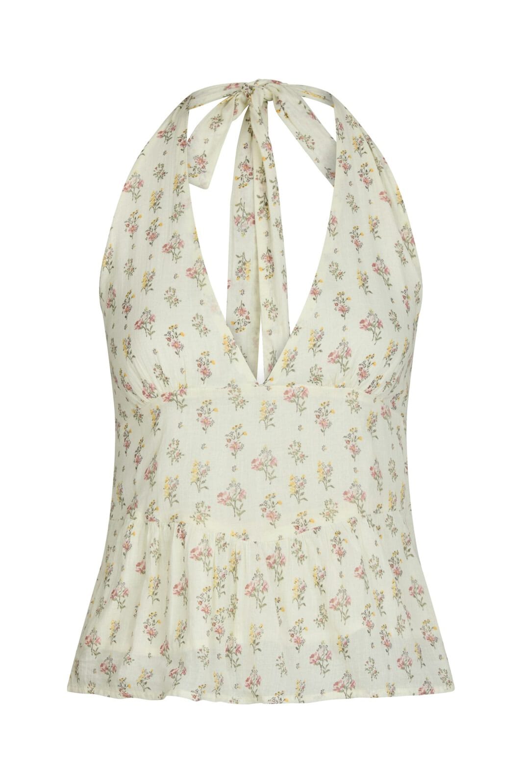 Crème-kleurige halterneck-top van Neo Noir met kleine bloemenprint. De top heeft een losse pasvorm met een volantrand onderaan en een bindband in de nek voor het aanpassen van de pasvorm.