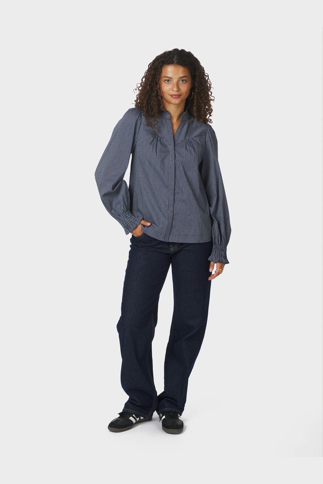 Donkerblauwe gestreepte blouse van Neo Noir met een hoge hals en lange mouwen. De blouse heeft smockmanchetten en een klein rucheskraagje, evenals knopen aan de voorkant voor sluiting.