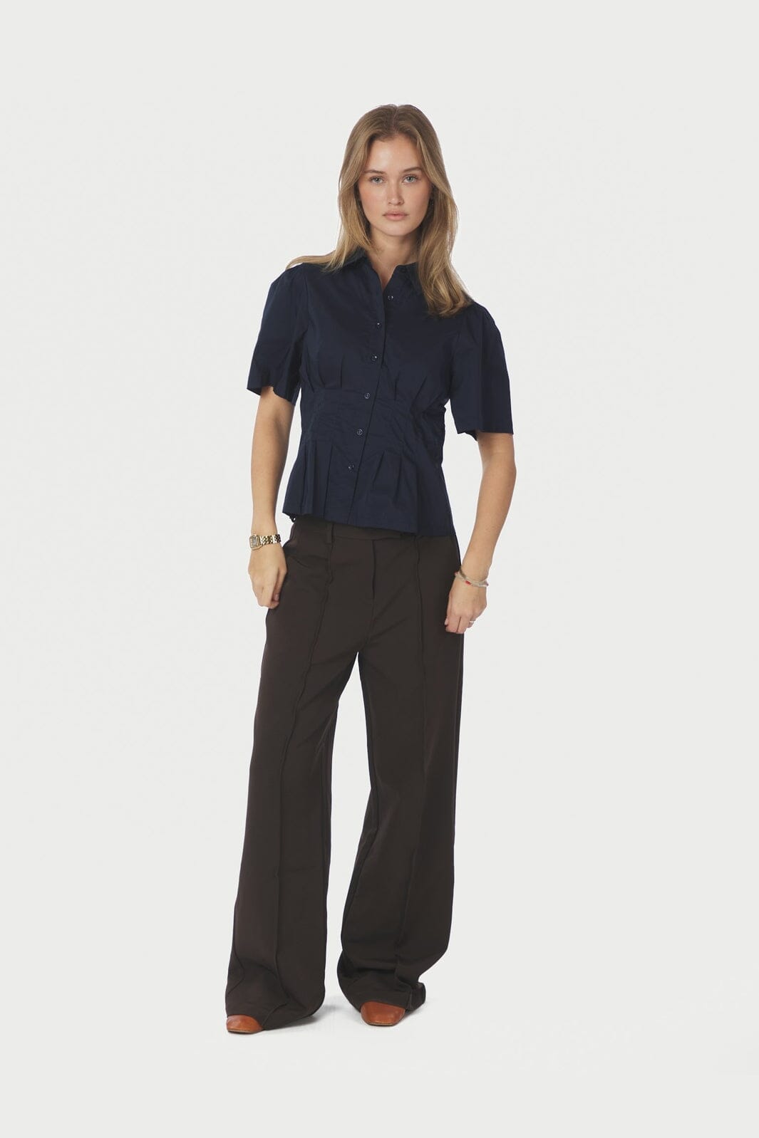 Donkerblauw shirt van Neo Noir, gemaakt van popelinekwaliteit. Het shirt heeft korte mouwen, een knoopsluiting aan de voorkant en een overhemdkraag met decoratieve stiksels en plooien.