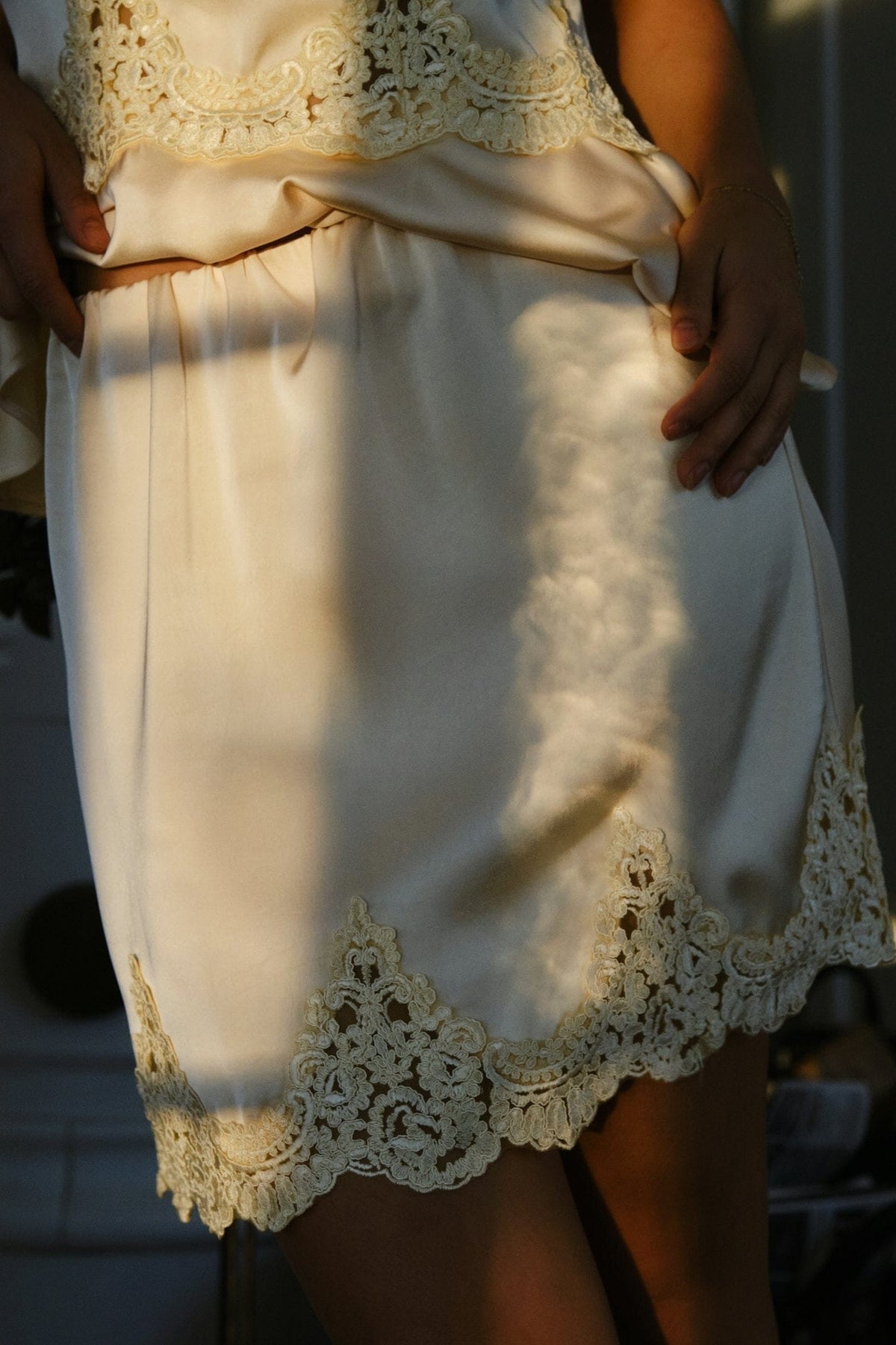 Rok van Neo Noir in lichtgeel satijn. De rok heeft een korte lengte en een decoratieve kanten rand aan de onderkant.